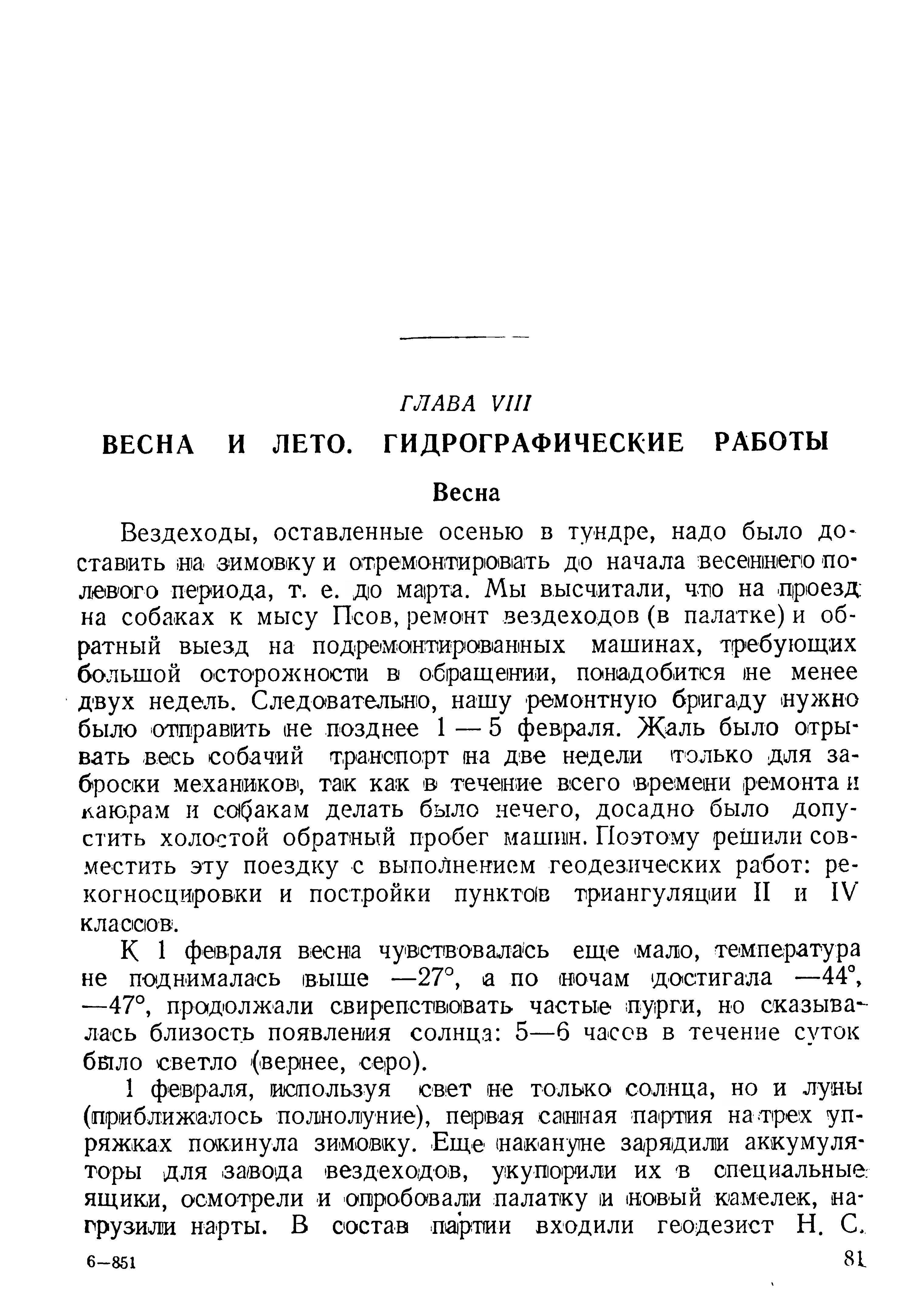 1 февраля, используя свет не только солнца, но и луны (приближалось полнолуние), первая санная партия на трех упряжках покинула зимовку. Еще накануне зарядили аккумуляторы для завода вездеходов, укупорили их в специальные ящики, осмотрели и опробовали палатку и новый камелек, нагрузили нарты. В состав партии входили геодезист Н. С.