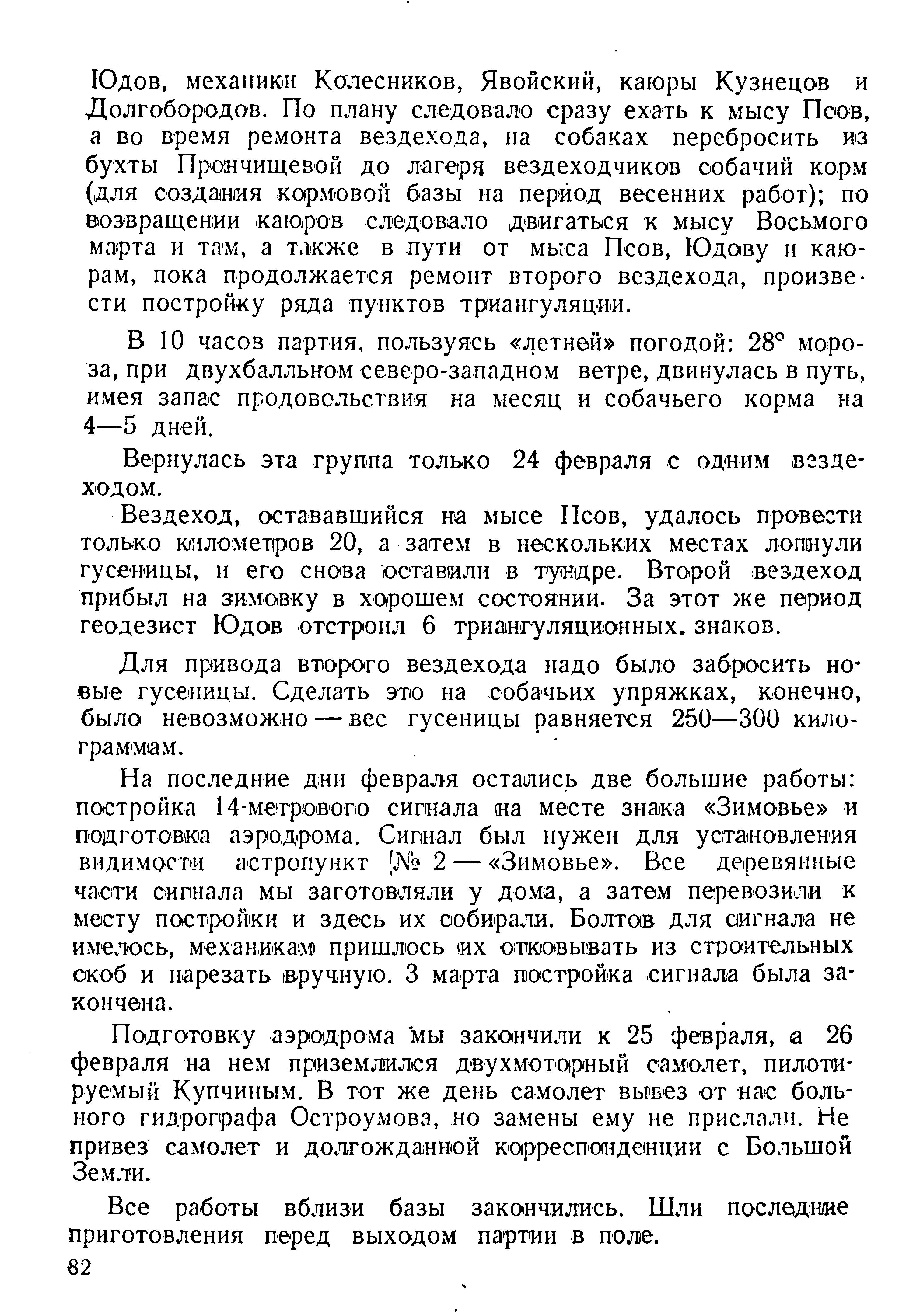Юдов, механики Колесников, Явойский, каюры Кузнецов и Долгобородов. По плану следовало сразу ехать к мысу Псов, а во время ремонта вездехода, на собаках перебросить из бухты Прончищевой до лагеря вездеходчиков собачий корм (для создания кормовой базы на период весенних работ); по возвращении каюров следовало двигаться к мысу Восьмого марта и там, а также в пути от мыса Псов, Юдову и каюрам, пока продолжается ремонт второго вездехода, произвести постройку ряда пунктов триангуляции.