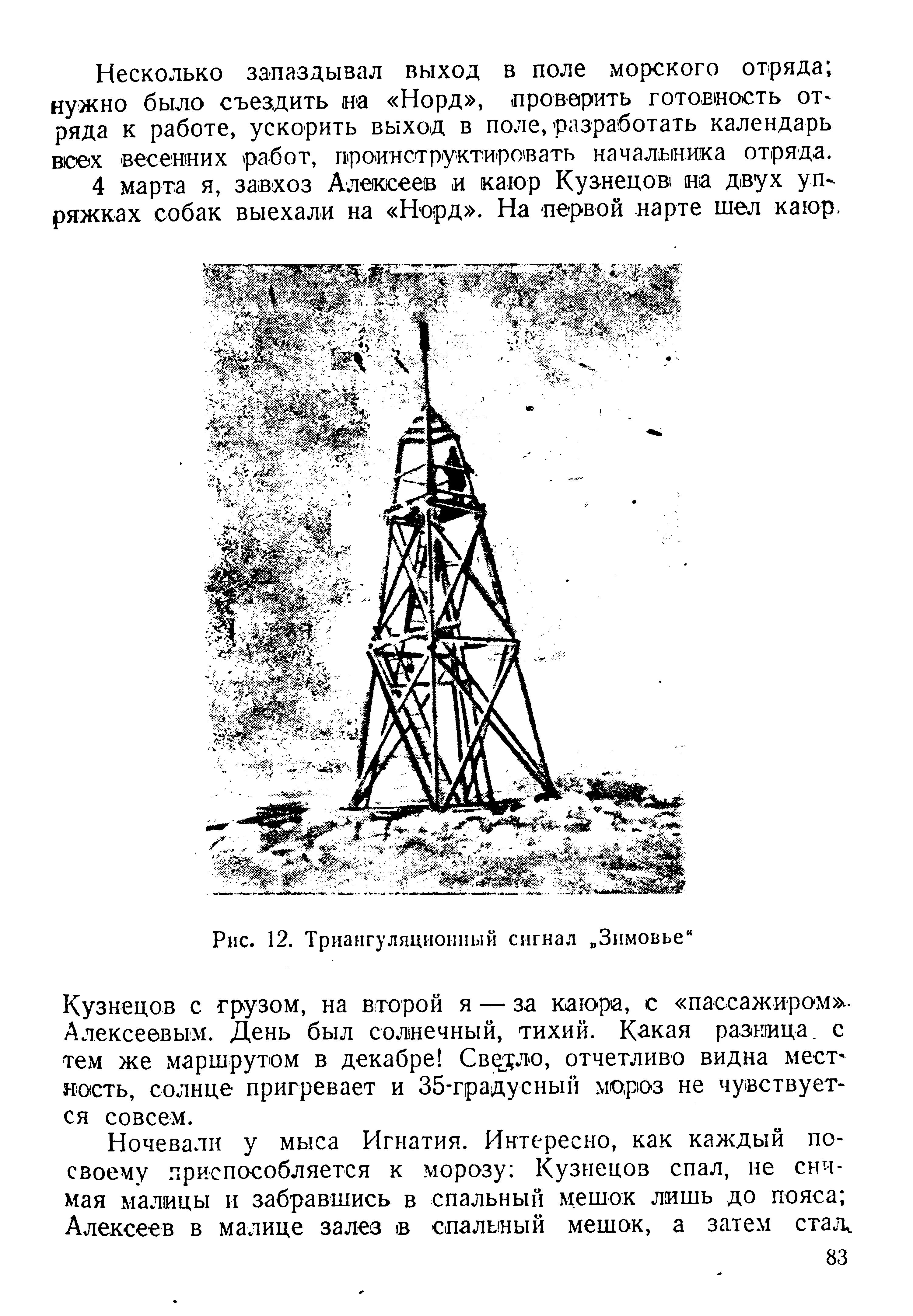 На последние дни февраля остались две большие работы: постройка 14-метрового сигнала на месте знака «Зимовье» и подготовка аэродрома. Сигнал был нужен для установления видимости астропункт № 2 — «Зимовье». Все деревянные части сигнала мы заготовляли у дома, а затем перевозили к месту постройки и здесь их собирали. Болтов для сигнала не имелось, механикам пришлось их отковывать из строительных скоб и нарезать вручную. 3 марта постройка сигнала была закончена.