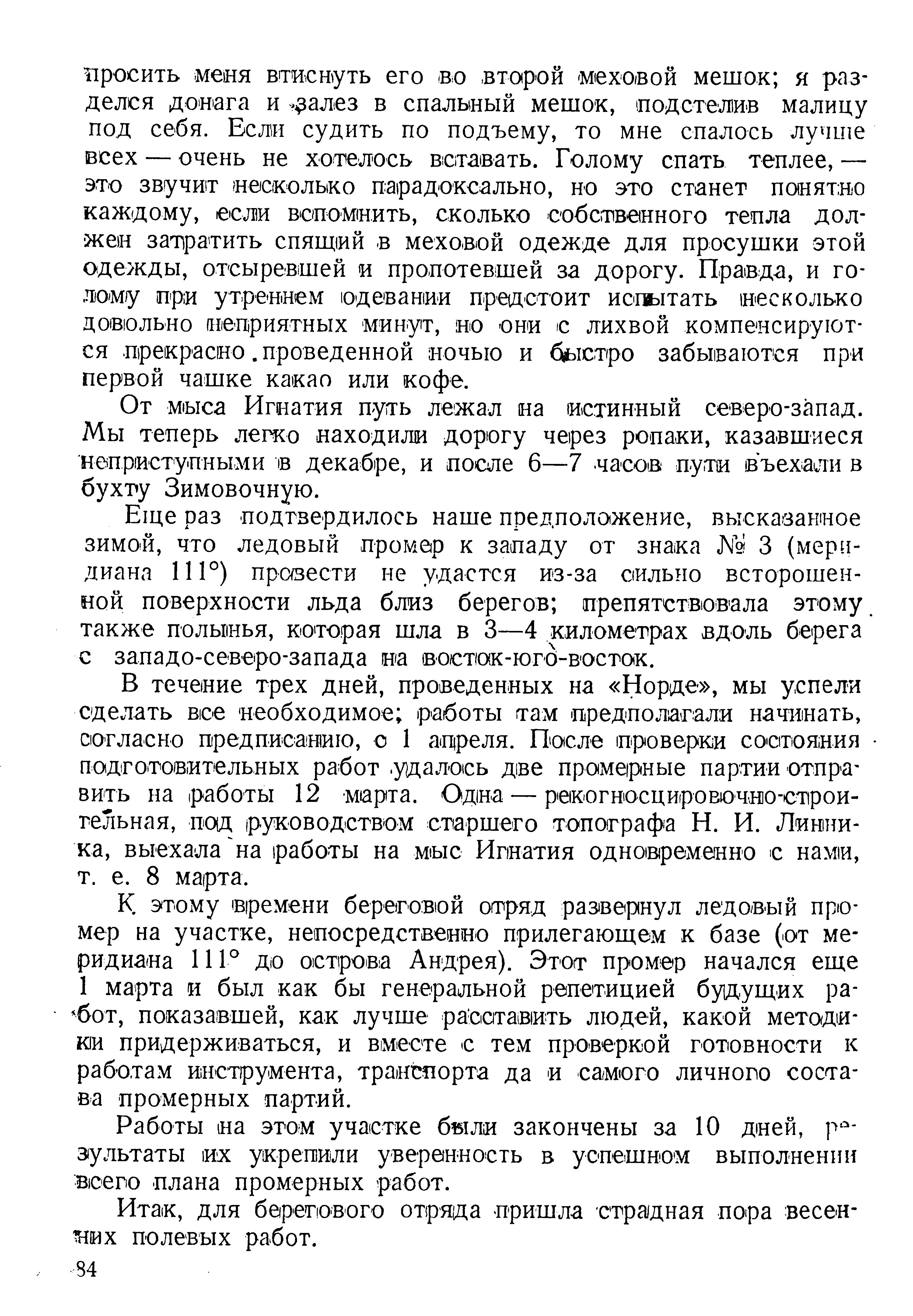 В течение трех дней, проведенных на «Норде», мы успели сделать все необходимое; работы там предполагали начинать, согласно предписанию, с 1 апреля. После проверки состояния подготовительных работ удалось две промерные партии отправить на работы 12 марта. Одна — рекогносцировочно-строительная, под руководством старшего топографа Н. И. Линника, выехала на работы на мыс Игнатия одновременно с нами, т. е. 8 марта.