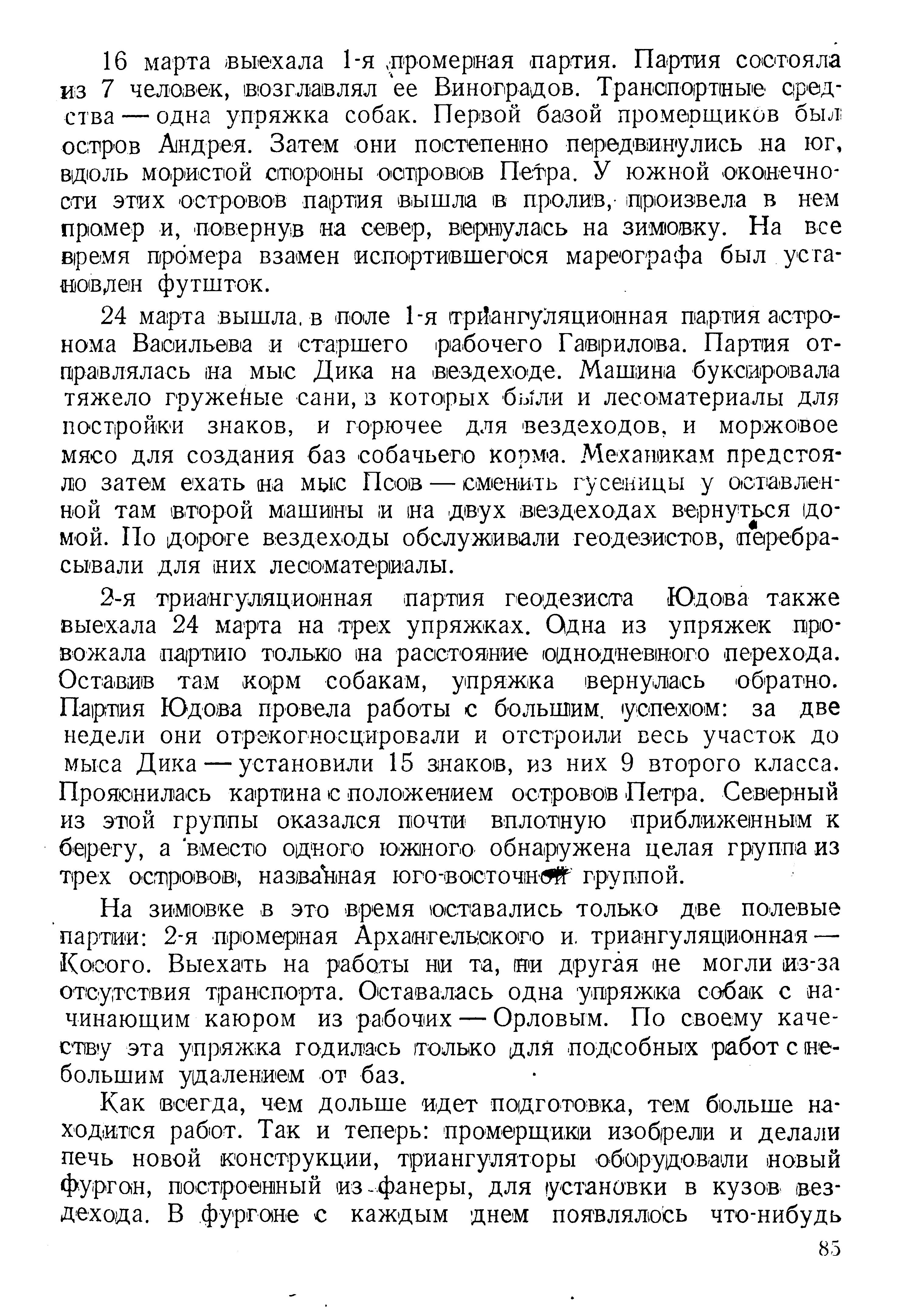 На зимовке в это время оставались только две полевые партии: 2-я промерная Архангельского и триангуляционная — Косого. Выехать на работы ни та, ни другая не могли из-за отсутствия транспорта. Оставалась одна упряжка собак с начинающим каюром из рабочих — Орловым. По своему качеству эта упряжка гадилась только для подсобных работ с небольшим удалением от баз.