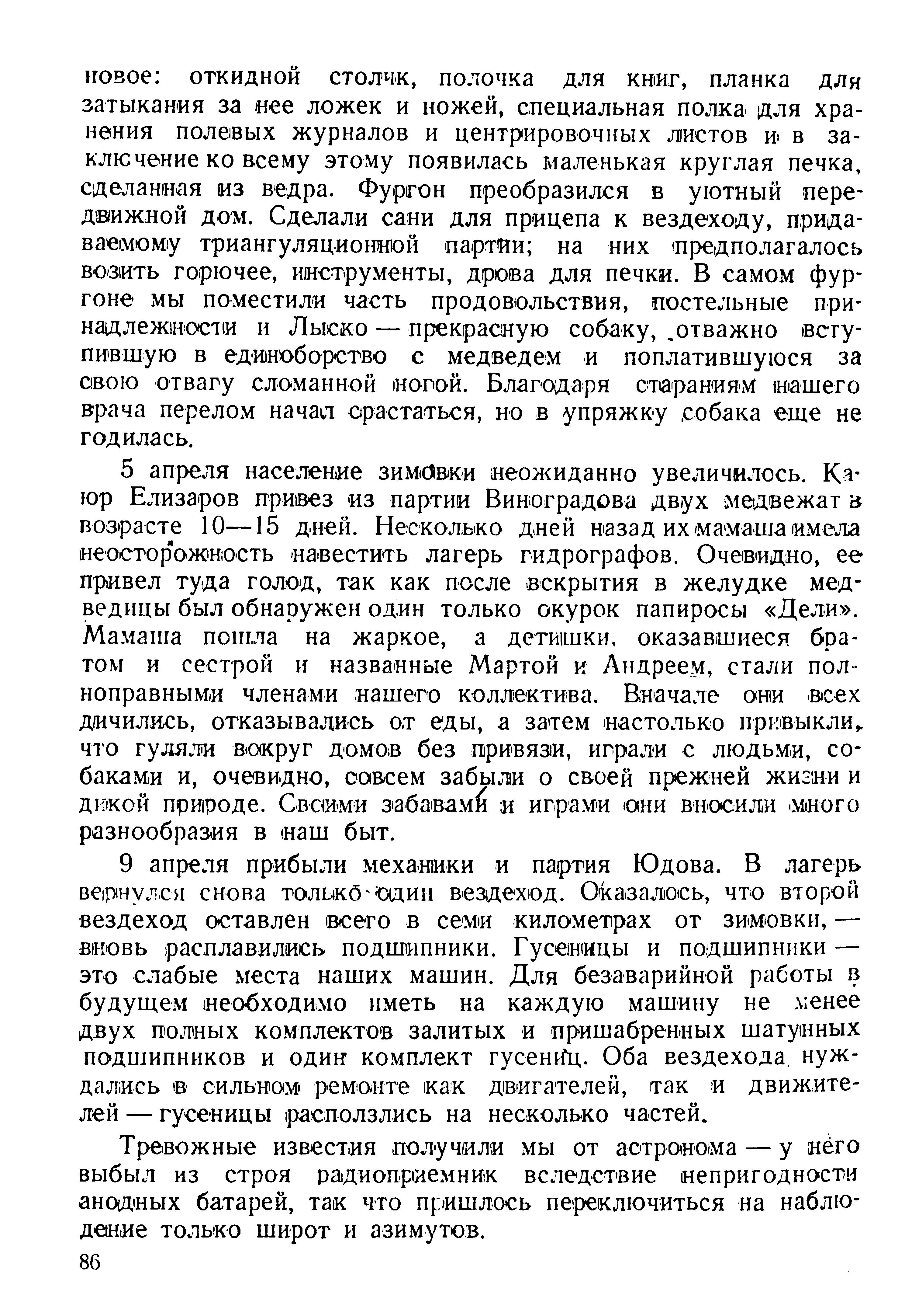 5 апреля население зимовки неожиданно увеличилось. Каюр Елизаров привез из партии Виноградова двух медвежат в возрасте 10—15 дней. Несколько дней назад их мамаша имела неосторожность навестить лагерь гидрографов. Очевидно, ее привел туда голод, так как после вскрытия в желудке медведицы был обнаружен один только окурок папиросы «Дели». Мамаша пошла на жаркое, а детишки, оказавшиеся братом и сестрой и названные Мартой и Андреем, стали полноправными членами нашего коллектива. Вначале они всех дичились, отказывались от еды, а затем настолько привыкли, что гуляли вокруг домов без привязи, играли с людьми, собаками и, очевидно, совсем забыли о своей прежней жизни и дикой природе. Своими забавами и играми они вносили много разнообразия в наш быт.
