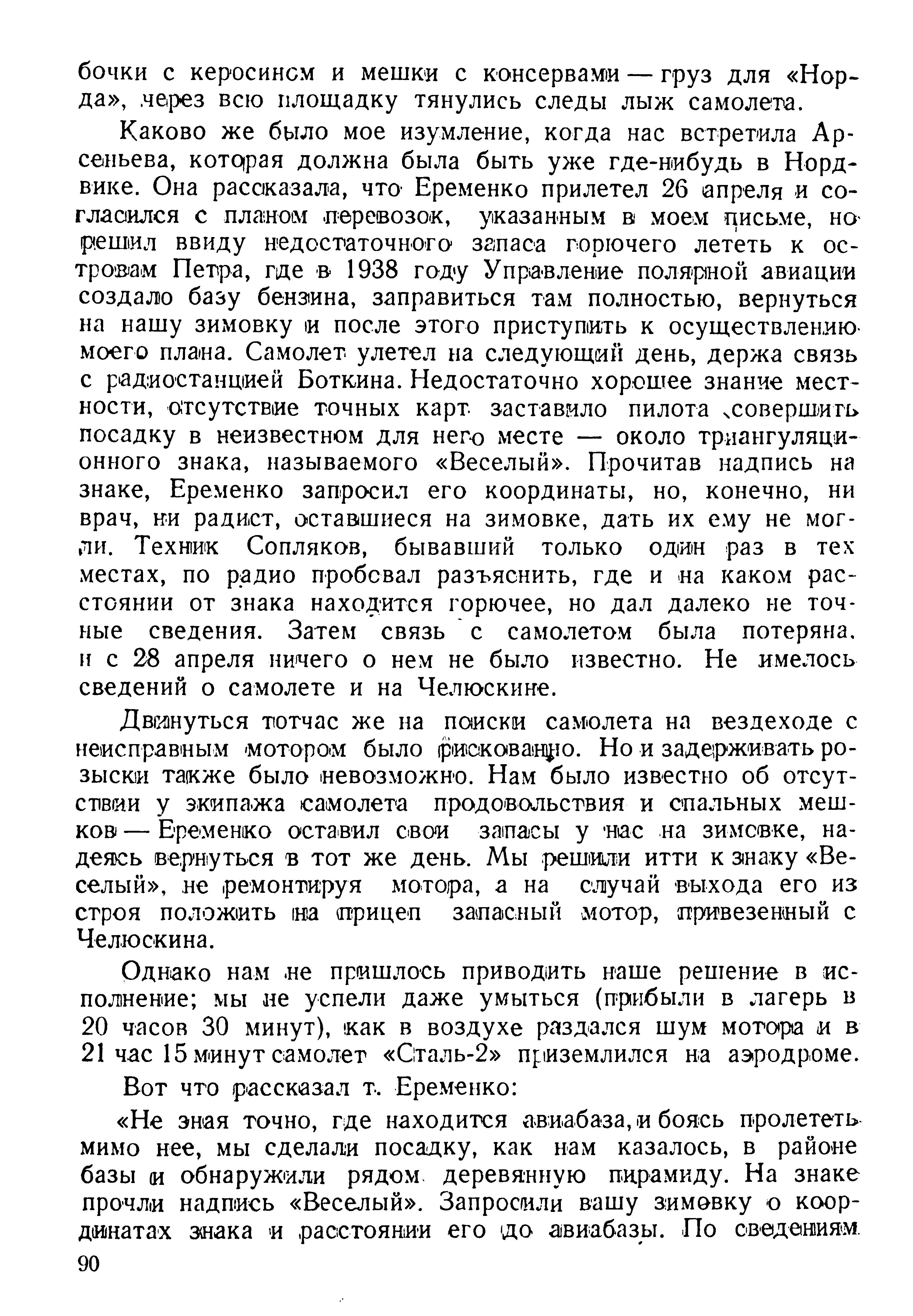 Каково же было мое изумление, когда нас встретила Арсеньева, которая должна была быть уже где-нибудь в Нордвике. Она рассказала, что Еременко прилетел 26 апреля и согласился с планом перевозок, указанным в моем письме, но решил ввиду недостаточного запаса горючего лететь к островам Петра, где в 1938 году Управление полярной авиации создало базу бензина, заправиться там полностью, вернуться на нашу зимовку и после этого приступить к осуществлению моего плана. Самолет улетел на следующий день, держа связь с радиостанцией Боткина. Недостаточно хорошее знание местности, отсутствие точных карт заставило пилота совершить посадку в неизвестном для него месте — около триангуляционного знака, называемого «Веселый». Прочитав надпись на знаке, Еременко запросил его координаты, но, конечно, ни врач, ни радист, оставшиеся на зимовке, дать их ему не могли. Техник Сопляков, бывавший только один раз в тех местах, по радио пробовал разъяснить, где и на каком расстоянии от знака находится горючее, но дал далеко не точные сведения. Затем связь с самолетом была потеряна, и с 28 апреля ничего о нем не было известно. Не имелось сведений о самолете и на Челюскине.