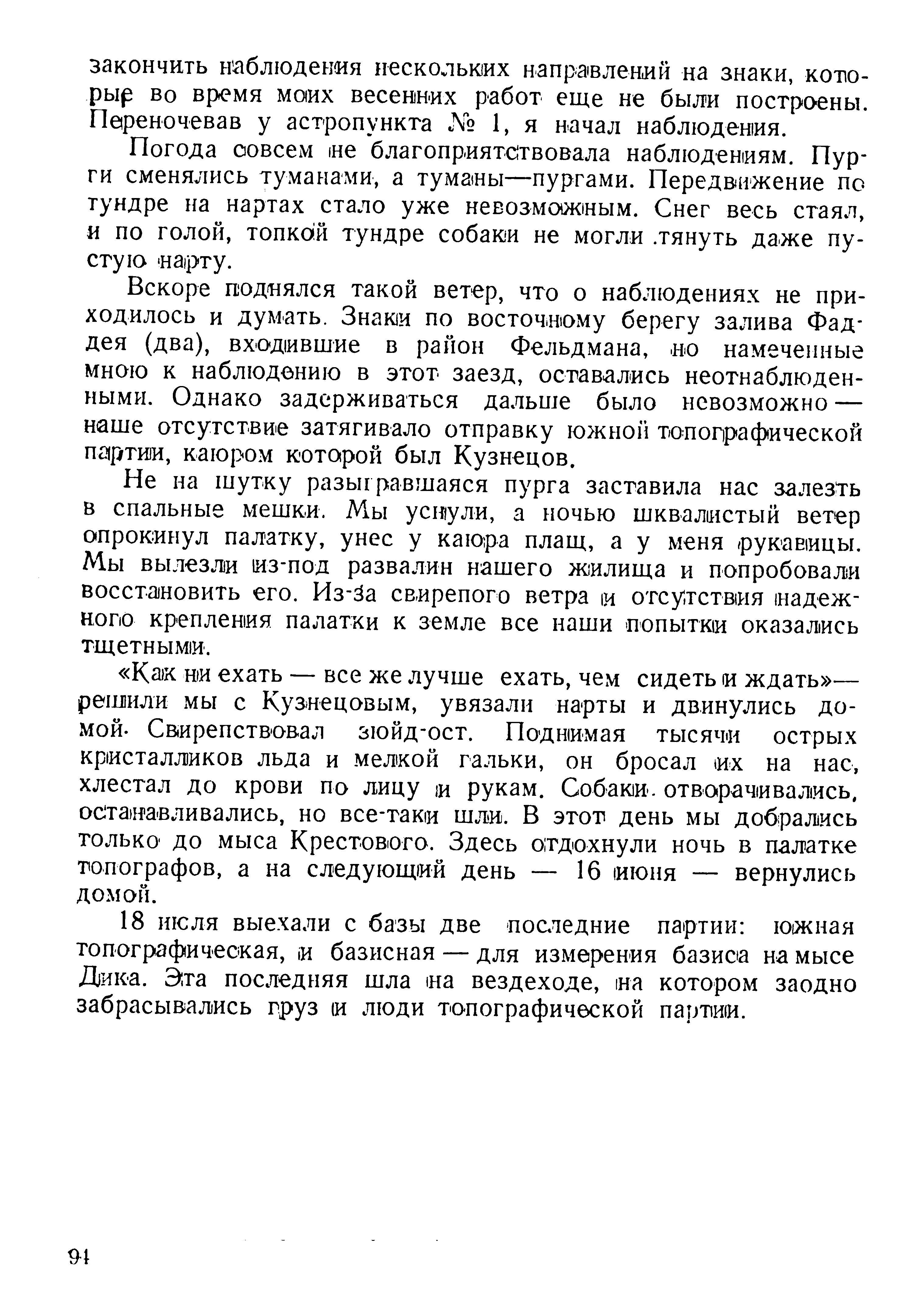 «Как ни ехать — все же лучше ехать, чем сидеть и ждать» — решили мы с Кузнецовым, увязали нарты и двинулись домой. Свирепствовал зюйд-ост. Поднимая тысячи острых кристалликов льда и мелкой гальки, он бросал их на нас, хлестал до крови по лицу и рукам. Собаки, отворачивались, останавливались, но все-таки шли. В этот день мы добрались только до мыса Крестового. Здесь отдохнули ночь в палатке топографов, а на следующий день — 16 июня — вернулись домой.