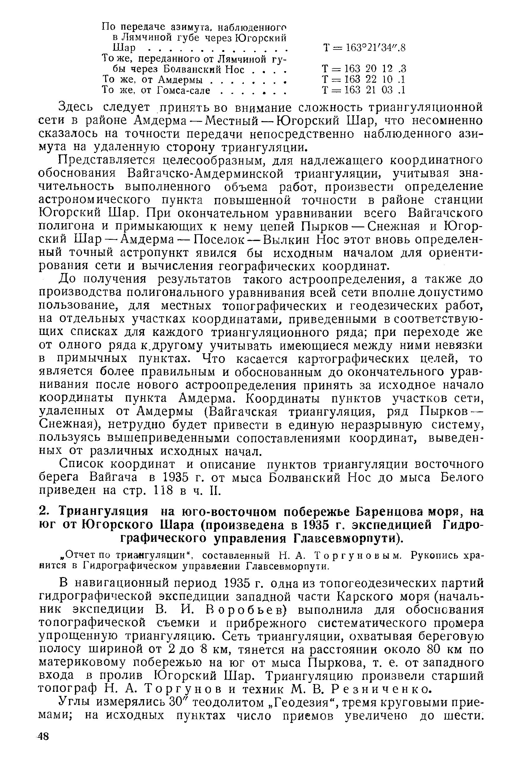 2. Триангуляция на юго-восточном побережье Баренцова моря, на юг от Югорского Шара (произведена в 1935 г. экспедицией Гидрографического управления Главсевморпути).