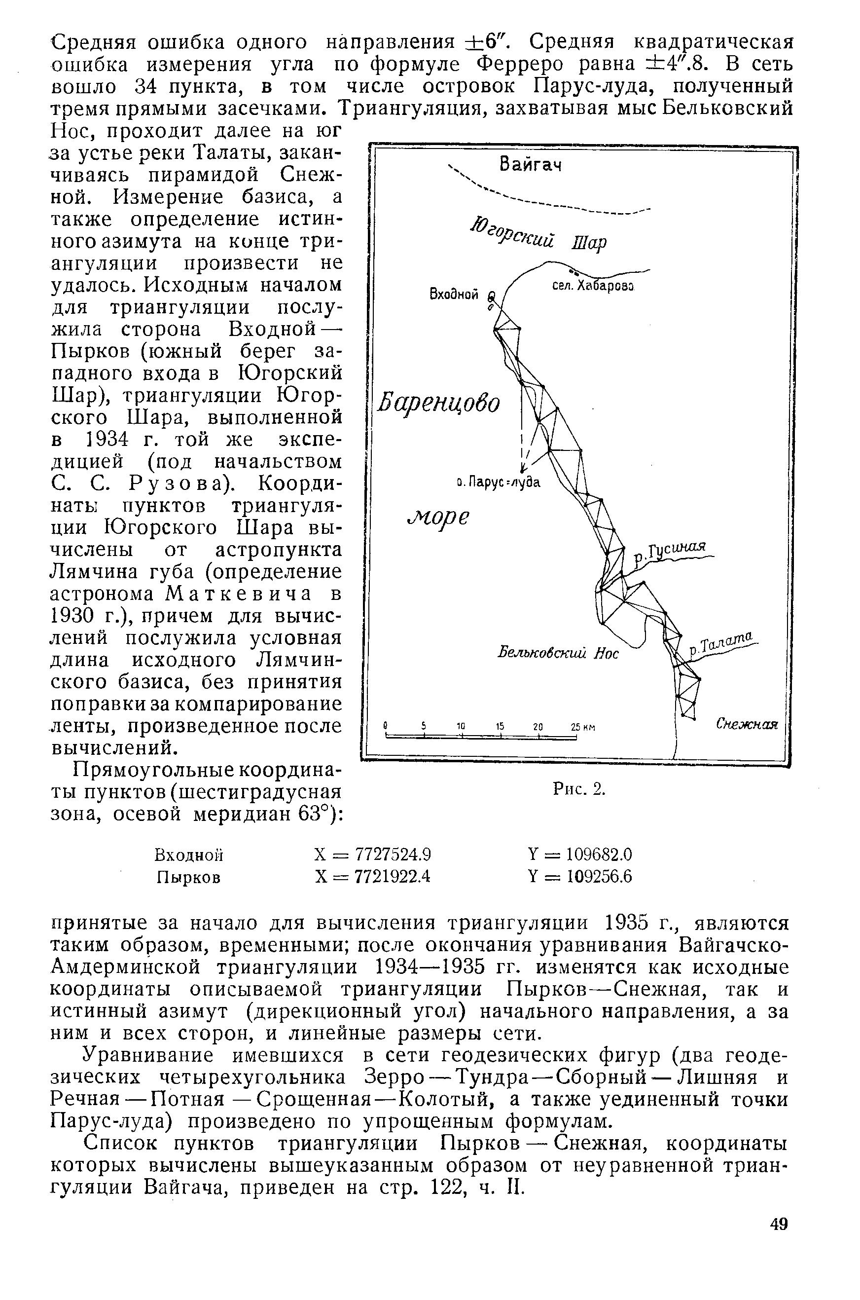 Углы измерялись 30" теодолитом „Геодезия", тремя круговыми приемами; на исходных пунктах число приемов увеличено до шести. Средняя ошибка одного направления ±6". Средняя квадратическая ошибка измерения угла по формуле Ферреро равна ±4".8. В сеть вошло 34 пункта, в том числе островок Парус-луда, полученный тремя прямыми засечками. Триангуляция, захватывая мыс Бельковский Нос, проходит далее на юг за устье реки Талаты, заканчиваясь пирамидой Снежной. Измерение базиса, а также определение истинного азимута на конце триангуляции произвести не удалось. Исходным началом для триангуляции послужила сторона Входной — Пырков (южный берег западного входа в Югорский Шар), триангуляции Югорского Шара, выполненной в 1934 г. той же экспедицией (под начальством С. С. Рузова). Координаты пунктов триангуляции Югорского Шара вычислены от астропункта Лямчина губа (определение астронома Маткевича в 1930 г. ), причем для вычислений послужила условная длина исходного Лямчинского базиса, без принятия поправки за компарирование ленты, произведенное после вычислений.