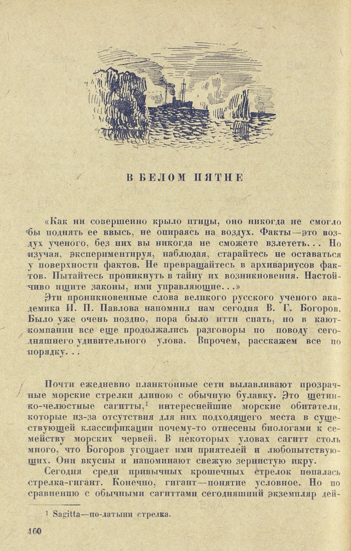 Почти ежедневно планктонные сети вылавливают прозрачные морские стрелки длиною с обычную булавку. Это щетинко-челюстные сагитты, {1} интереснейшие морские обитатели, которые из-за отсутствия для них подходящего места в существующей классификации почему-то отнесены биологами к семейству морских червей. В некоторых уловах сагитт столь много, что Богоров угощает ими приятелей и любопытствующих. Они вкусны и напоминают свежую зернистую икру.