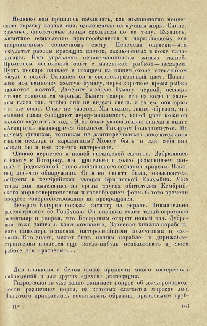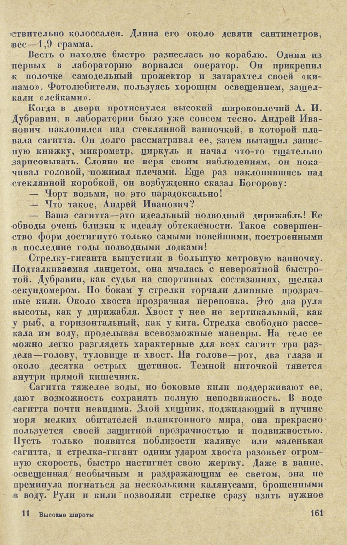 Вечером Ешурин показал сагитту на экране. Внимательно рассматривает ее Горбунов. Он впервые видит такой огромный экземпляр и уверен, что Богоровым открыт новый вид. Дубравин тоже зашел в кают-компанию. Записная книжка корабельного инженера исписана интереснейшими подсчетами и схемами. Кто знает, может быть нашим корабле- и дирижабле-строителям придется еще когда-нибудь использовать в своей работе эти «расчеты»...