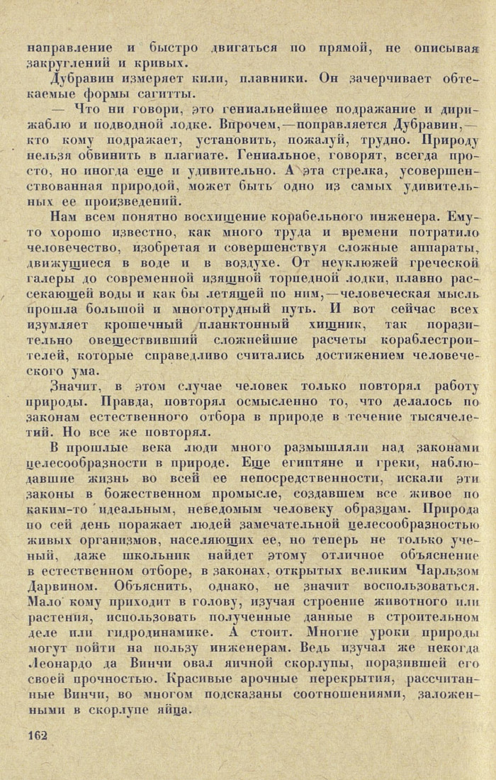 — Что ни говори, это гениальнейшее подражание и дирижаблю и подводной лодке. Впрочем, — поправляется Дубравин, кто кому подражает, установить, пожалуй, трудно. Природу нельзя обвинить в плагиате. Гениальное, говорят, всегда просто, но иногда еще и удивительно. А эта стрелка, усовершенствованная природой, может быть одно из самых удивительных ее произведений.