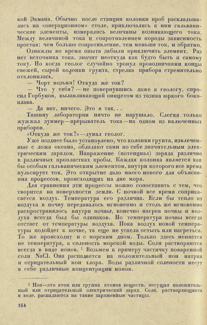 Уже позднее было установлено, что колонки грунта, извлеченные с ложа океана, обладают сами но себе значительным электрическим зарядом. Напряжение (потенциал) заряда различно в различных пропластках пробы. Каждая колонка является как бы особым гальваническим элементом, внутри которого все время пульсирует ток. Это открытие дало много нового для объяснения процессов, происходящих на дне моря.