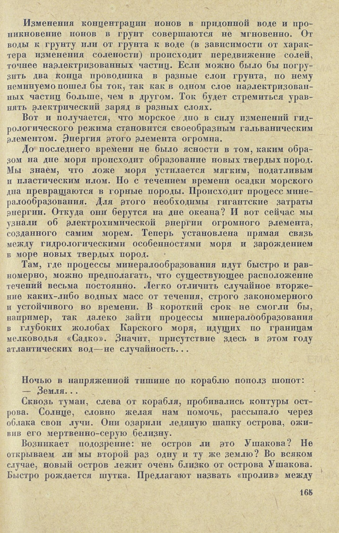 До последнего времени не было ясности в том, каким образом на дне моря происходит образование новых твердых пород. Мы знаем, что ложе моря устилается мягким, податливым и пластическим илом. Но с течением времени осадки морского дна превращаются в горные породы. Происходит процесс минералообразования. Для этого необходимы гигантские затраты энергии. Откуда они берутся на дне океана? И вот сейчас мы узнали об электрохимической энергии огромного элемента, созданного самим морем. Теперь установлена прямая связь между гидрологическими особенностями моря и зарождением в море новых твердых пород.