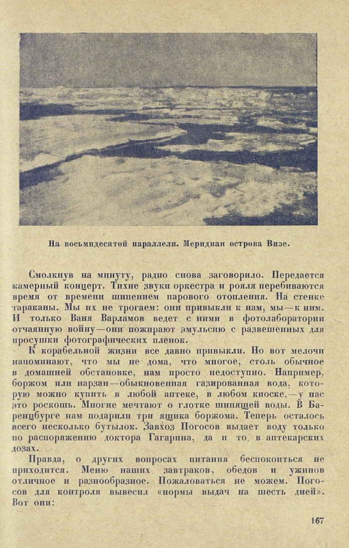 К корабельной жизни все давно привыкли. Но вот мелочи напоминают, что мы не дома, что многое, столь обычное в домашней обстановке, нам просто недоступно. Например, боржом или нарзан — обыкновенная газированная вода, которую можно купить в любой аптеке, в любом киоске, — у нас это роскошь. Многие мечтают о глотке шипящей воды. В Баренцбурге нам подарили три ящика боржома. Теперь осталось всего несколько бутылок. Завхоз Погосов выдает воду только по распоряжению доктора Гагарина, да и то. в аптекарских дозах.