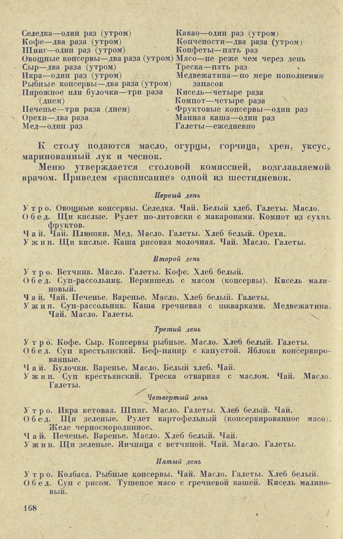 Первый деньУтро. Овощные консервы. Селедка. Чай. Белый хлеб. Галеты. Масло.