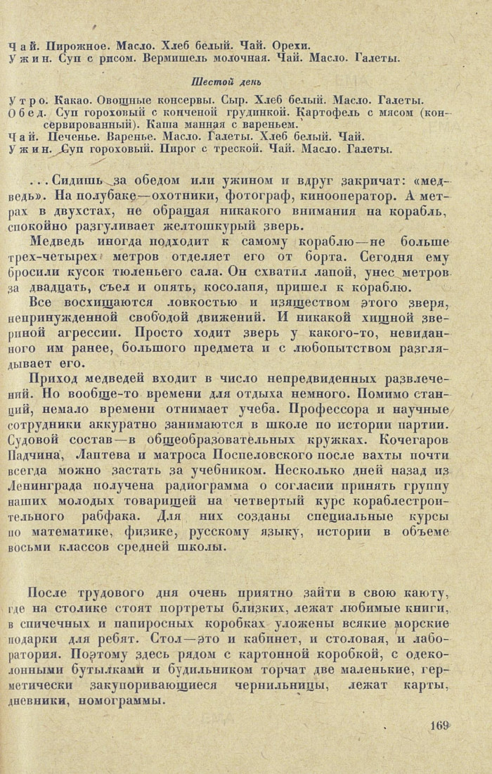 Приход медведей входит в число непредвиденных развлечений. Но вообще-то времени для отдыха немного. Помимо станций, немало времени отнимает учеба. Профессора и научные сотрудники аккуратно занимаются в школе по истории партии. Судовой состав — в общеобразовательных кружках. Кочегаров Падчина, Лаптева и матроса Поспеловского после вахты почти всегда можно застать за учебником. Несколько дней назад из Ленинграда получена радиограмма о согласии принять группу ваших молодых товарищей на четвертый курс кораблестроительного рабфака. Для них созданы специальные курсы по математике, физике, русскому языку, истории в объеме восьми классов средней школы.