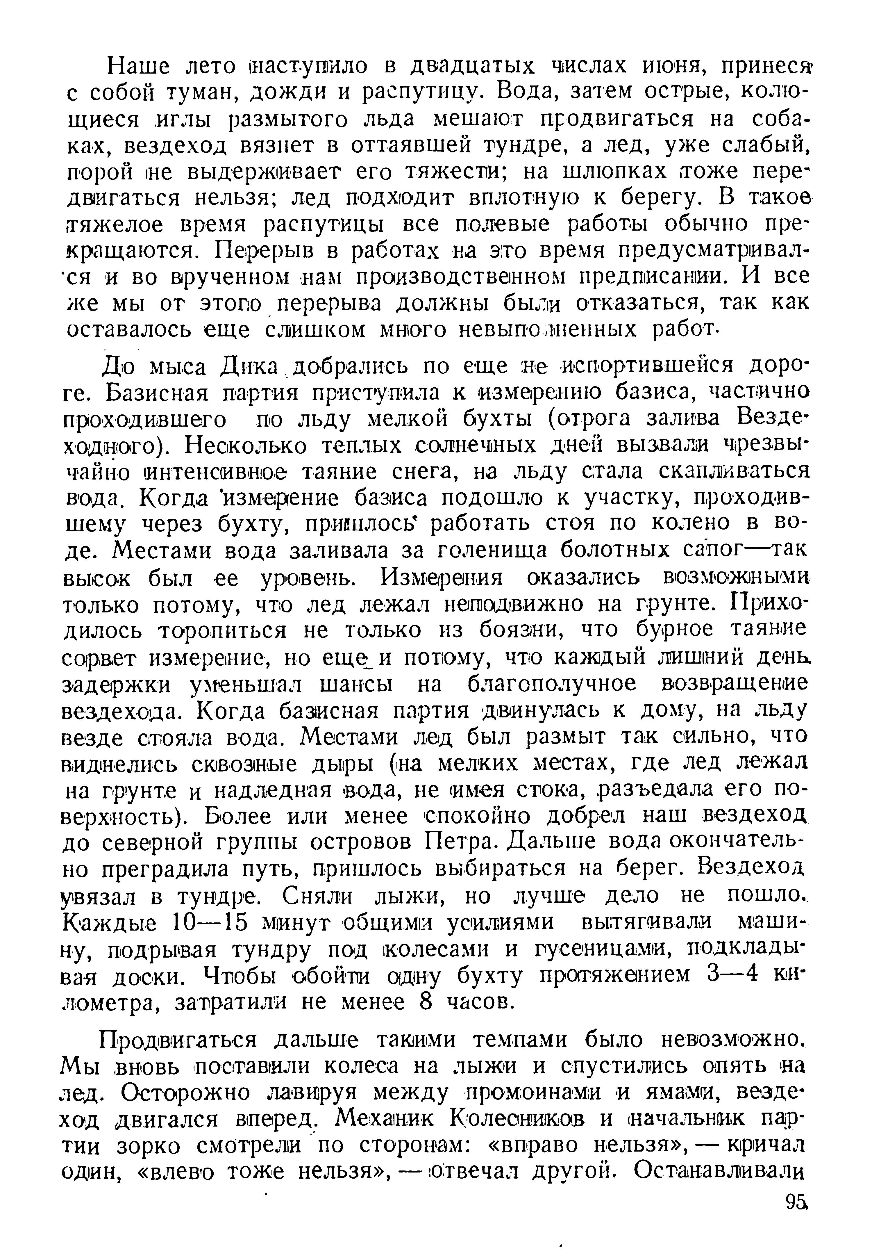 До мыса Дика добрались по еще не испортившейся дороге. Базисная партия приступила к измерению базиса, частично проходившего по льду мелкой бухты (отрога залива Вездеходного). Несколько теплых солнечных дней вызвали чрезвычайно интенсивное таяние снега, на льду стала скапливаться вода. Когда измерение базиса подошло к участку, проходившему через бухту, пришлось работать стоя по колено в воде. Местами вода заливала за голенища болотных сапог — так высок был ее уровень. Измерения оказались возможными только потому, что лед лежал неподвижно на грунте. Приходилось торопиться не только из боязни, что бурное таяние сорвет измерение, но еще и потому, что каждый лишний день задержки уменьшал шансы на благополучное возвращение вездехода. Когда базисная партия двинулась к дому, на льду везде стояла вода. Местами лед был размыт так сильно, что виднелись сквозные дыры (на мелких местах, где лед лежал на грунте и надледная вода, не имея стока, разъедала его поверхность). Более или менее спокойно добрел наш вездеход до северной группы островов Петра. Дальше вода окончательно преградила путь, пришлось выбираться на берег. Вездеход увязал в тундре. Сняли лыжи, но лучше дело не пошло. Каждые 10—15 минут общими усилиями вытягивали машину, подрывая тундру под колесами и гусеницами, подкладывая доски. Чтобы обойти одну бухту протяжением 3—4 километра, затратили не менее 8 часов.