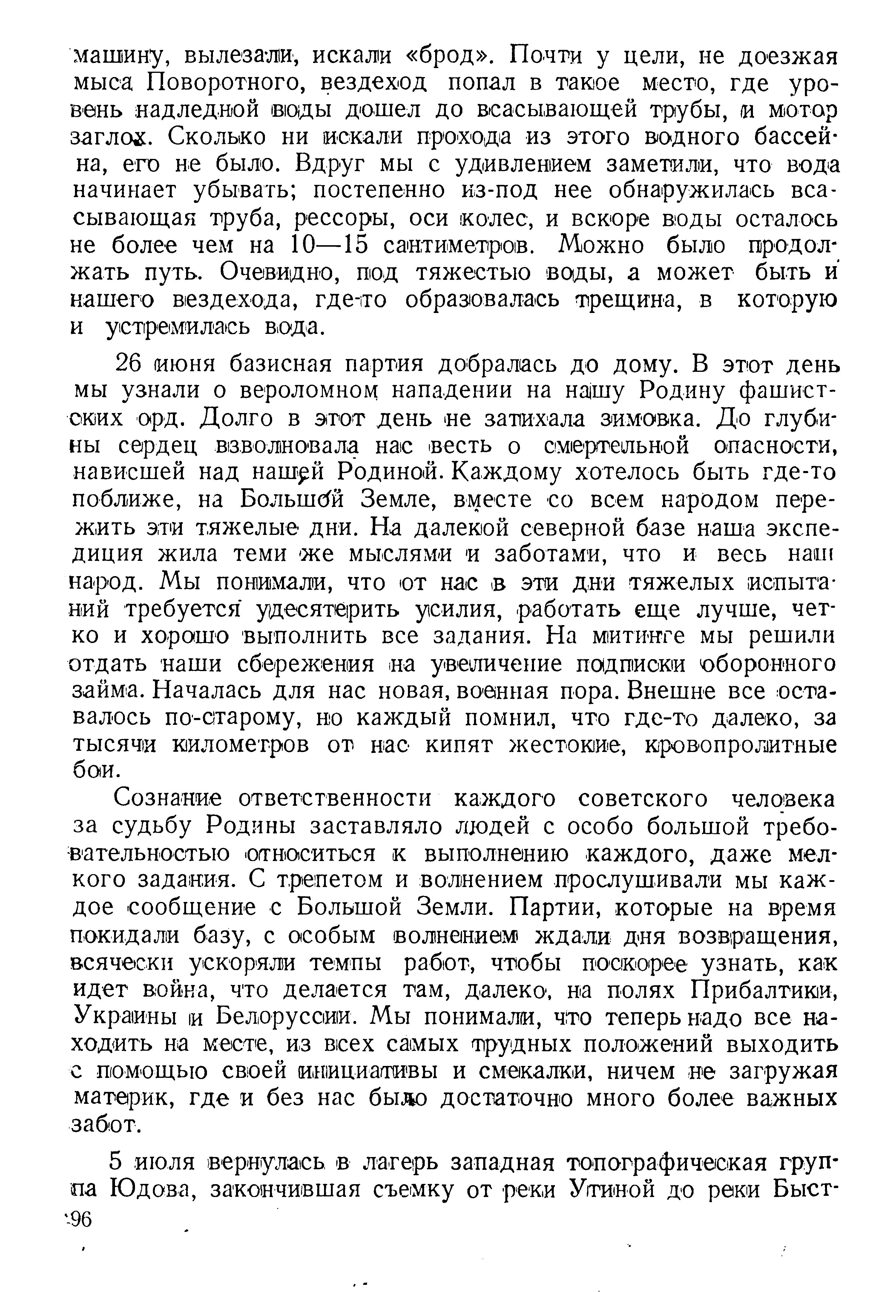 26 июня базисная партия добралась до дому. В этот день мы узнали о вероломном нападении на нашу Родину фашистских орд. Долго в этот день не затихала зимовка. До глубины сердец взволновала нас весть о смертельной опасности, нависшей над нашей Родиной. Каждому хотелось быть где-то поближе, на Большей Земле, вместе со всем народом пережить эти тяжелые дни. На далекой северной базе наша экспедиция жила теми же мыслями и заботами, что и весь наш народ. Мы понимали, что от нас в эти дни тяжелых испытаний требуется удесятерить усилия, работать еще лучше, четко и хорошо выполнить все задания. На митинге мы решили отдать наши сбережения на увеличение подписки оборонного займа. Началась для нас новая, военная пора. Внешне все оставалось по-старому, но каждый помнил, что где-то далеко, за тысячи километров от нас кипят жестокие, кровопролитные бои.