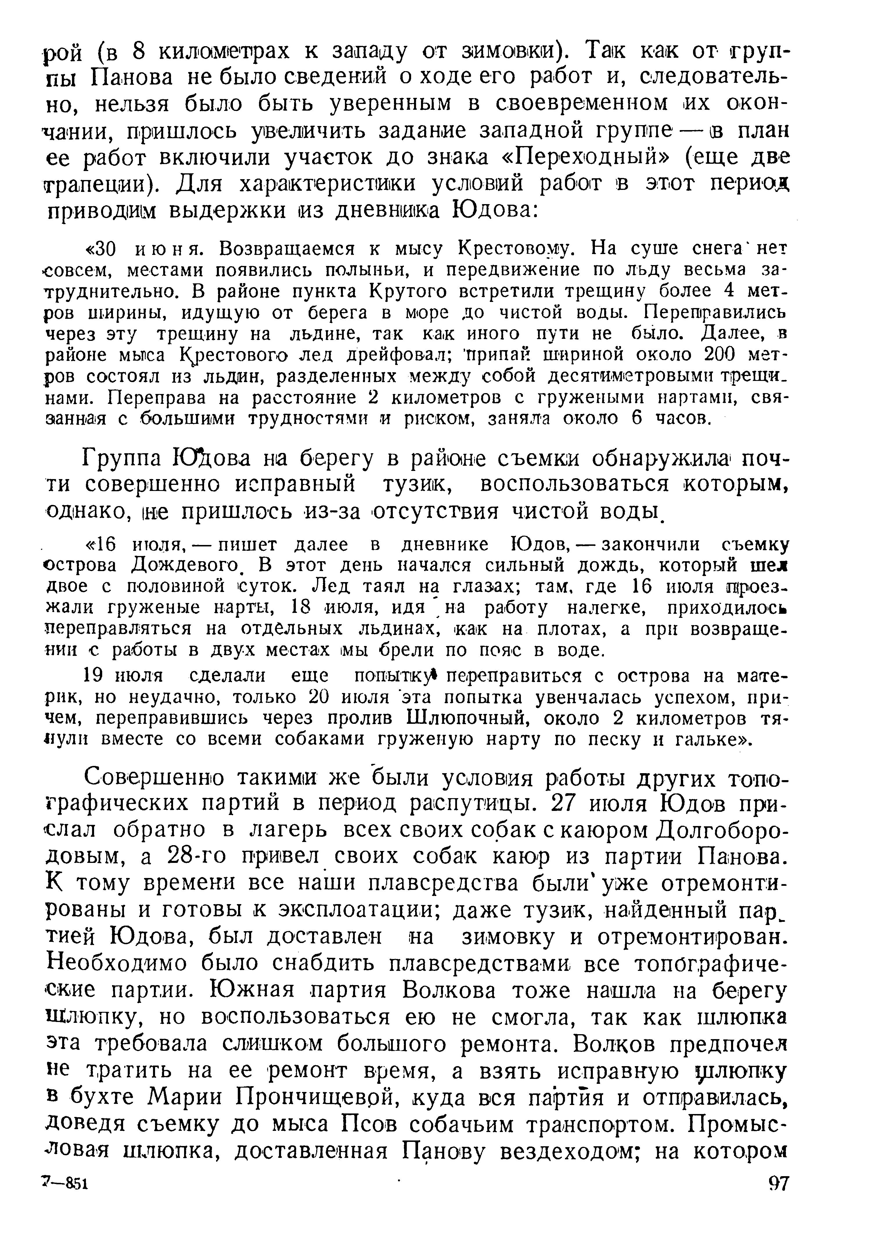 «30 июня. Возвращаемся к мысу Крестовому. На суше снега нет совсем, местами появились полыньи, и передвижение по льду весьма затруднительно. В районе пункта Крутого встретили трещину более 4 метров ширины, идущую от берега в море до чистой воды. Переправились через эту трещину на льдине, так как иного пути не было. Далее, в районе мыса Крестового лед дрейфовал; припай шириной около 200 метров состоял из льдин, разделенных между собой десятиметровыми трещинами. Переправа на расстояние 2 километров с гружеными нартами, связанная с большими трудностями и риском, заняла около 6 часов.
