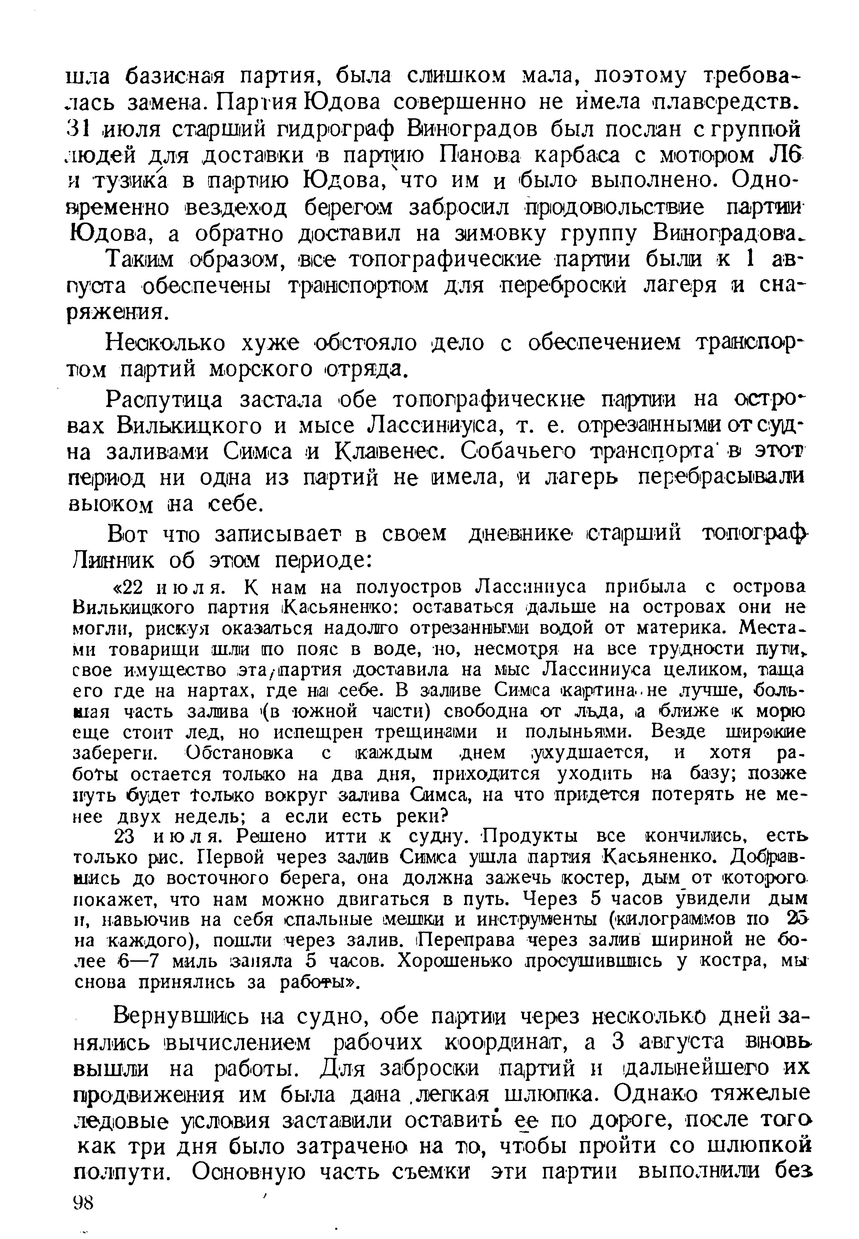 «22 июля. К нам на полуостров Лассиниуса прибыла с острова Вилькицкого партия Касьяненко: оставаться дальше на островах они не могли, рискуя оказаться надолго отрезанными водой от материка. Местами товарищи шли по пояс в воде, но, несмотря на все трудности пути свое имущество эта партия доставила на мыс Лассиниуса целиком, таща его где на нартах, где на себе. В заливе Симса картина не лучше, большая часть залива (в южной части) свободна от льда, а ближе к морю еще стоит лед, но испещрен трещинами и полыньями. Везде широкие забереги. Обстановка с каждым днем ухудшается, и хотя работы остается только на два дня, приходится уходить на базу; позже путь будет только вокруг залива Симса, на что придется потерять не менее двух недель; а если есть реки?