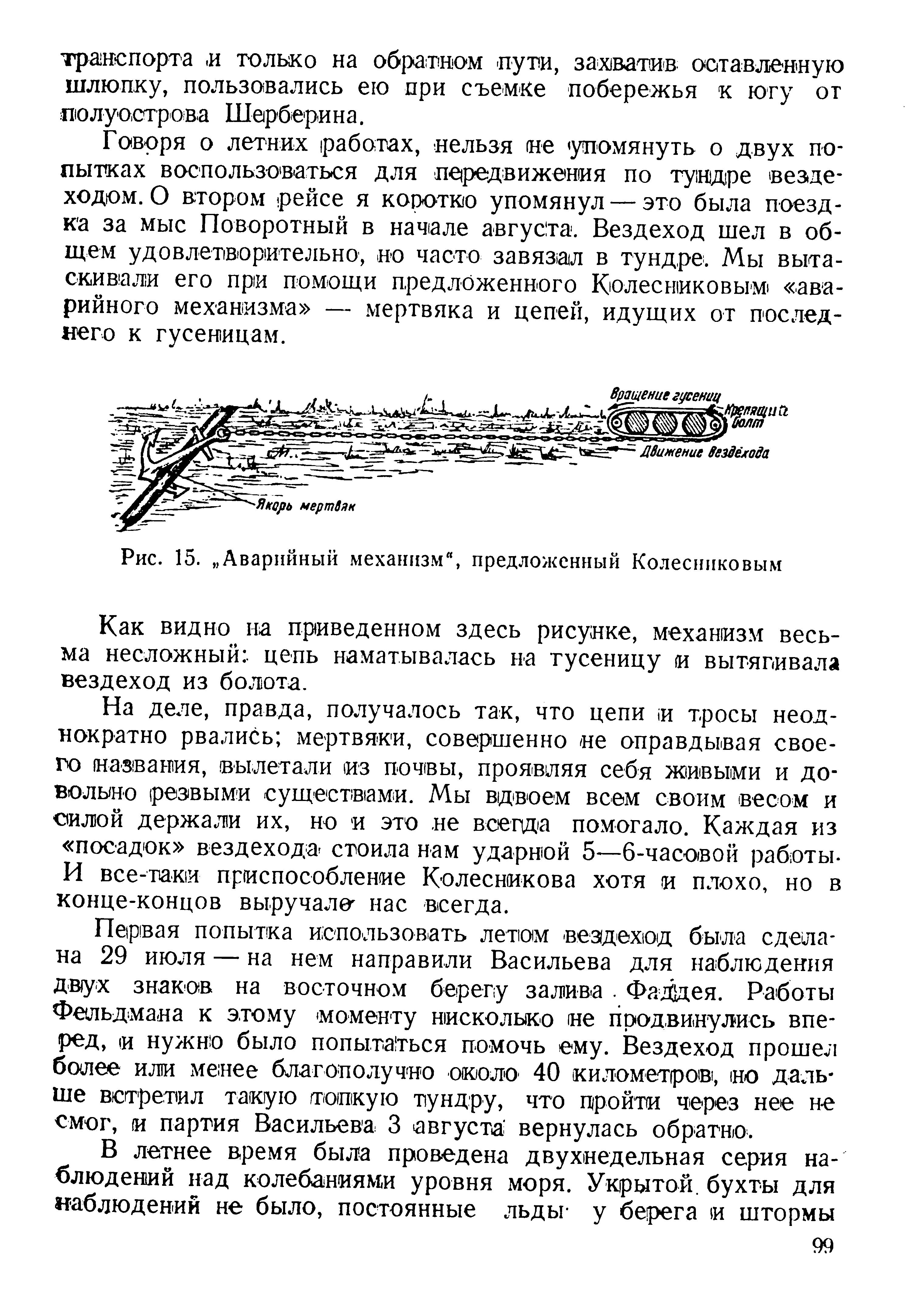 Говоря о летних работах, нельзя не упомянуть о двух попытках воспользоваться для передвижения по тундре вездеходом. О втором рейсе я коротко упомянул — это была поездка за мыс Поворотный в начале августа. Вездеход шел в общем удовлетворительно, но часто завязал в тундре. Мы вытаскивали его при помощи предложенного Колесниковым «аварийного механизма» — мертвяка и цепей, идущих от последнего к гусеницам.
