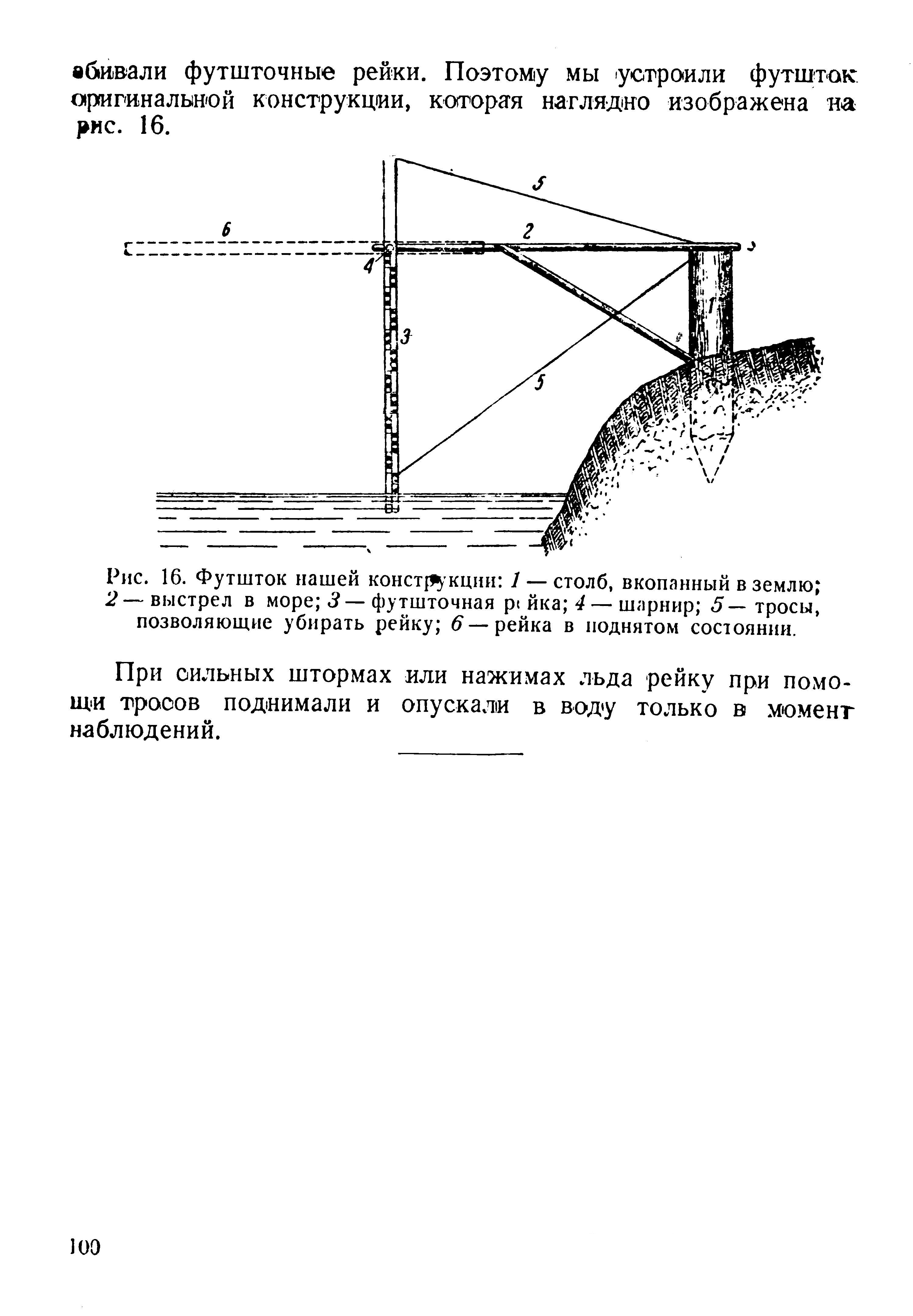 Рис. 16. Футшток нашей конструкции: 1 — столб, вкопанный в землю; 2— выстрел в море; 3— футшточная pейка; 4 — шарнир; 5— тросы, позволяющие убирать рейку; 6—рейка в поднятом состоянии.