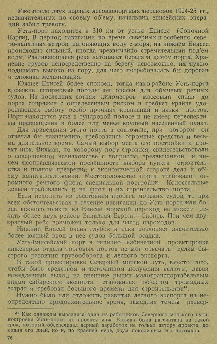 {41} Как однажды выразился один из работников Северного морского пути, постройка Усть-порта по проекту инж. Вихман была рассчитана на такой срок, который обеспечивал верный заработок не только автору проекта, до конца его дней, но и, но крайней мере, двум поколениям его потомков.