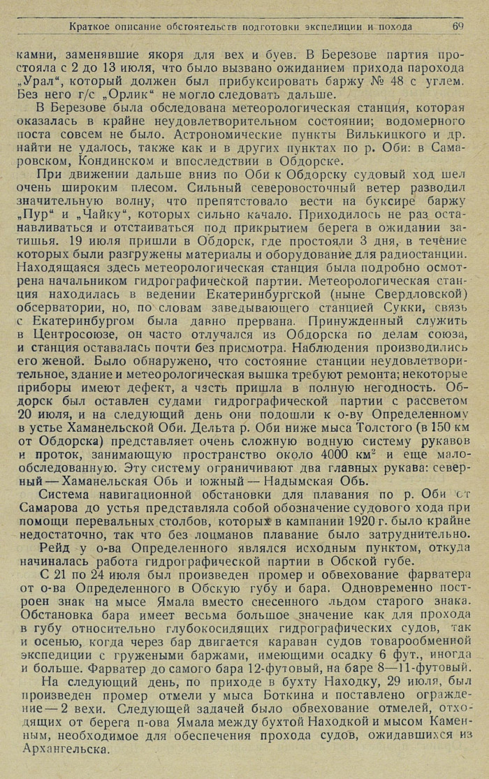 При движении дальше вниз по Оби к Обдорску судовый ход шел очень широким плесом. Сильный северовосточный ветер разводил значительную волну, что препятстовало вести на буксире баржу „Пур" и „Чайку", которых сильно качало. Приходилось не раз останавливаться и отстаиваться под прикрытием берега в ожидании затишья. 19 июля пришли в Обдорск, где простояли 3 дня, в течение которых были разгружены материалы и оборудование для радиостанции. Находящаяся здесь метеорологическая станция была подробно осмотрена начальником гидрографической партии. Метеорологическая станция находилась в ведении Екатеринбургской (ныне Свердловской) обсерватории, но, по словам заведывающего станцией Сукки, связь с Екатеринбургом была давно прервана. Принужденный служить в Центросоюзе, он часто отлучался из Обдорска по делам союза, и станция оставалась почти без присмотра. Наблюдения производились его женой. Было обнаружено, что состояние станции неудовлетворительное, здание и метеорологическая вышка требуют ремонта; некоторые приборы имеют дефект, а часть пришла в полную негодность. Обдорск был оставлен судами гидрографической партии с рассветом 20 июля, и на следующий день они подошли к о-ву Определенному в устье Хаманельской Оби. Дельта р. Оби ниже мыса Толстого (в 150 км от Обдорска) представляет очень сложную водную систему рукавов и проток, занимающую пространство около 4000 км2 и еще мало-обследованную. Эту систему ограничивают два главных рукава: северный — Хаманельская Обь и южный — Надымская Обь.