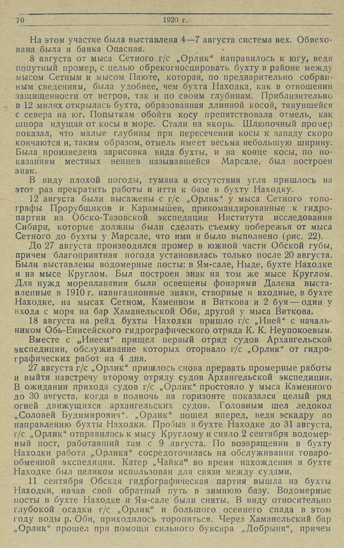 27 августа г/с „Орлик" пришлось снова прервать промерные работы и выйти навстречу второму отряду судов Архангельской экспедиции. В ожидании прихода судов г/с „Орлик" простояло у мыса Каменного до 30 августа, когда в полночь на горизонте показался целый ряд огней движущихся архангельских судов. Головным шел ледокол „Соловей Будимирович". „Орлик" пошел вперед, ведя эскадру по направлению бухты Находки. Пробыв в бухте Находке до 31 августа, г/с „Орлик" отправилось к мысу Круглому и сняло 2 сентября водомерный пост, работавший там с 9 августа. По возвращении в бухту Находки работа „Орлика" сосредоточилась на обслуживании товарообменной экспедиции. Катер „Чайкам во время нахождения в бухте Находке был целиком использован для связи между судами.