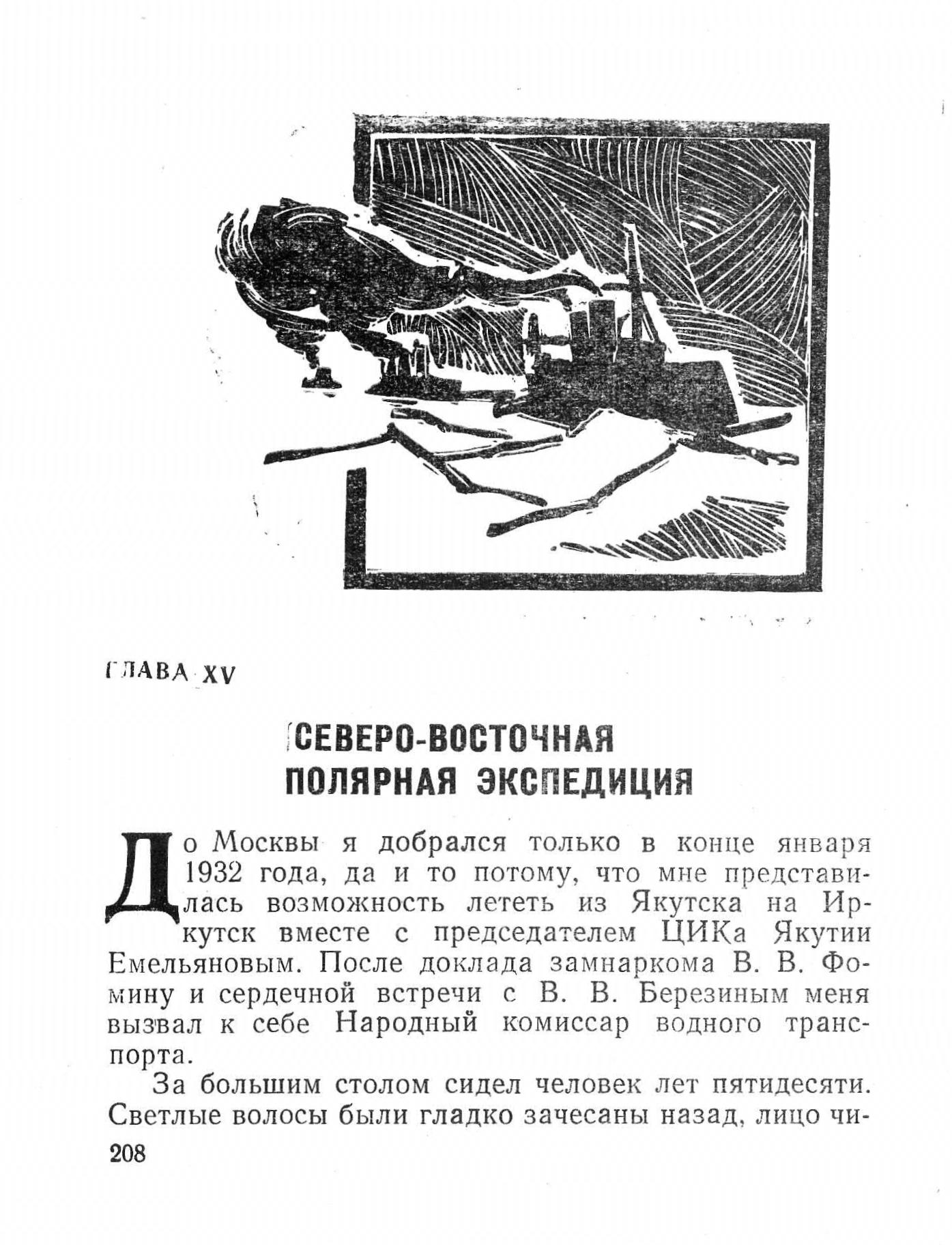 СЕВЕРО-ВОСТОЧНАЯ ПОЛЯРНАЯ ЭКСПЕДИЦИЯДо Москвы я добрался только в конце января 1932 года, да и то потому, что мне представилась возможность лететь из Якутска на Иркутск вместе с председателем ЦИКа Якутии Емельяновым. После доклада замнаркома В. В. Фомину и сердечной встречи с В. В. Березиным меня вызвал к себе Народный комиссар водного транспорта.