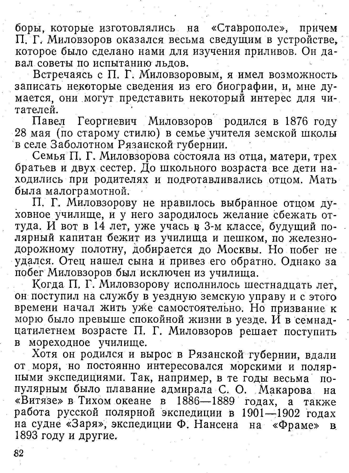 Встречаясь с П. Г. Миловзоровым, я имел возможность записать некоторые сведения из его биографии, и, мне думается, они могут представить некоторый интерес для читателей.