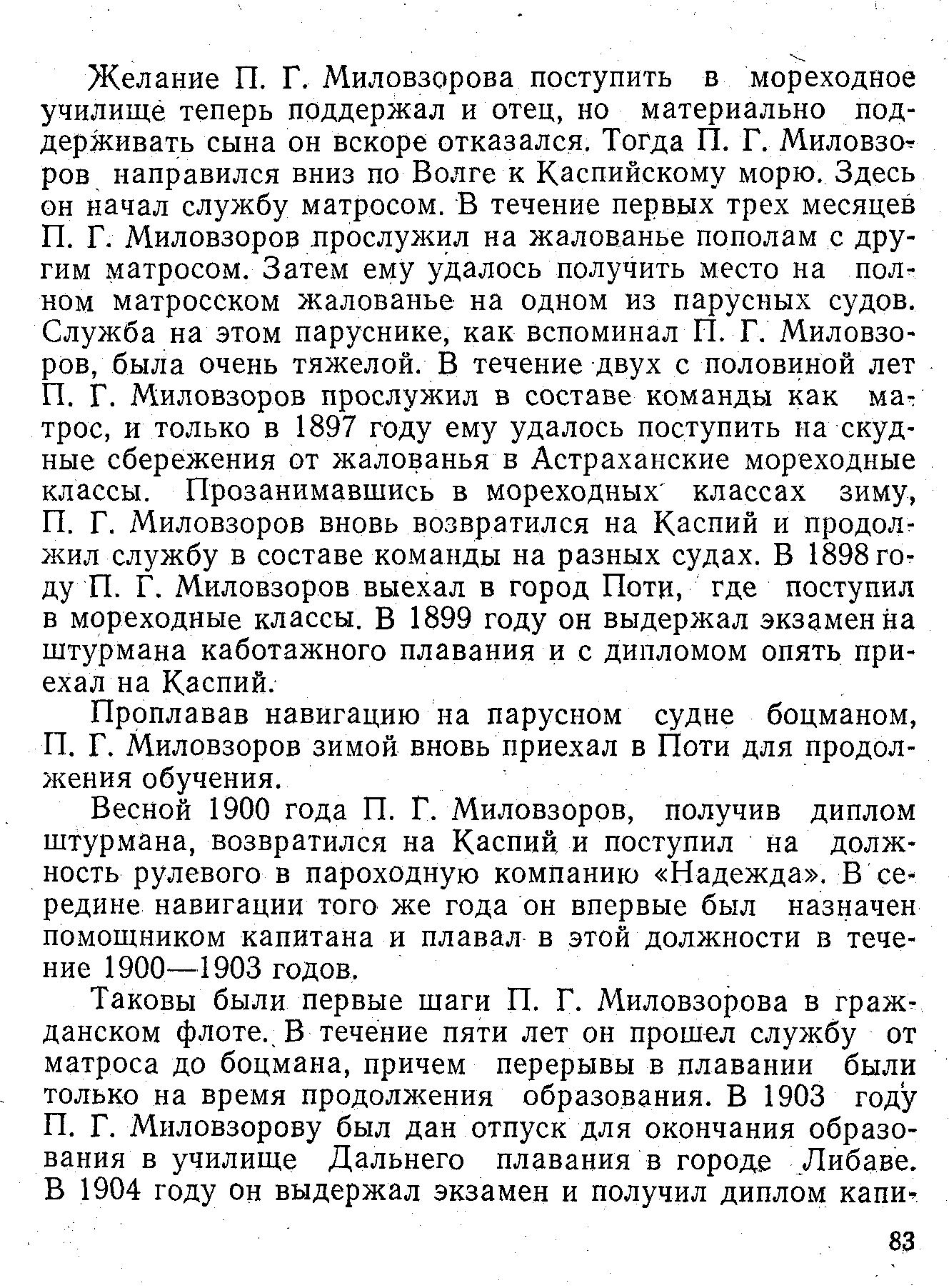 Таковы были первые шаги П. Г. Миловзорова в гражданском флоте. В течение пяти лет он прошел службу от матроса до боцмана, причем перерывы в плавании были только на время продолжения образования. В 1903 году П. Г. Миловзорову был дан отпуск для окончания образования в училище Дальнего плавания в городе Либаве. В 1904 году он выдержал экзамен и получил диплом капи-