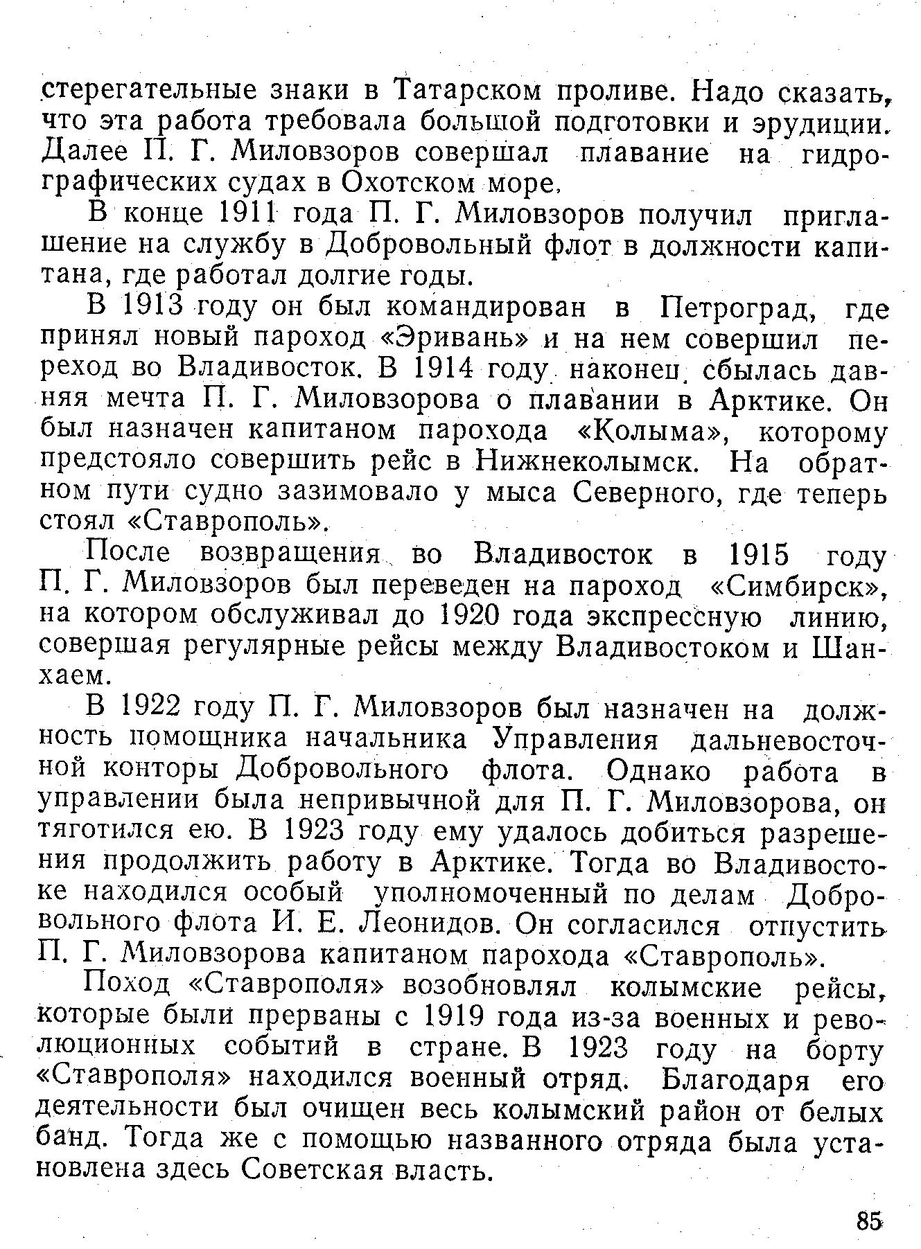П. Г. Миловзорова, как моряка, Дальний Восток привлекал своим выходом в Тихий океан и Восточную Арктику, последняя особенно была для него притягательна своей неизведанностью. Плавание в Японском и Охотском морях, а также у берегов Камчатки было трудным и еще мало освоенным. Для молодого моряка все это было очень заманчиво, предоставляло широкое поле деятельности.