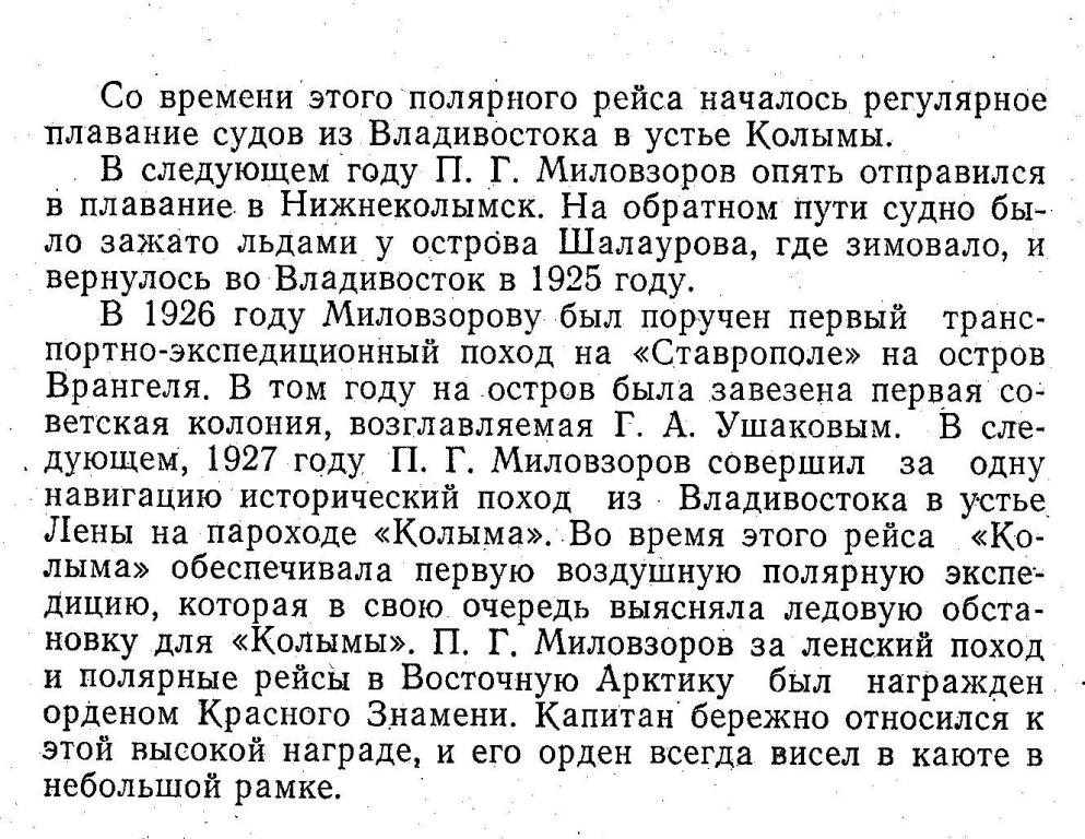 В 1926 году Миловзорову был поручен первый транспортно-экспедиционный поход на «Ставрополе» на остров Врангеля. В том году на остров была завезена первая советская колония, возглавляемая Г. А. Ушаковым. В следующем, 1927 году П. Г. Миловзоров совершил за одну навигацию исторический поход из Владивостока в устье Лены на пароходе «Колыма». Во время этого рейса «Колыма» обеспечивала первую воздушную полярную экспедицию, которая в свою очередь выясняла ледовую обстановку для «Колымы». П. Г. Миловзоров за ленский поход и полярные рейсы в Восточную Арктику был награжден орденом Красного Знамени. Капитан бережно относился к этой высокой награде, и его орден всегда висел в каюте в небольшой рамке.