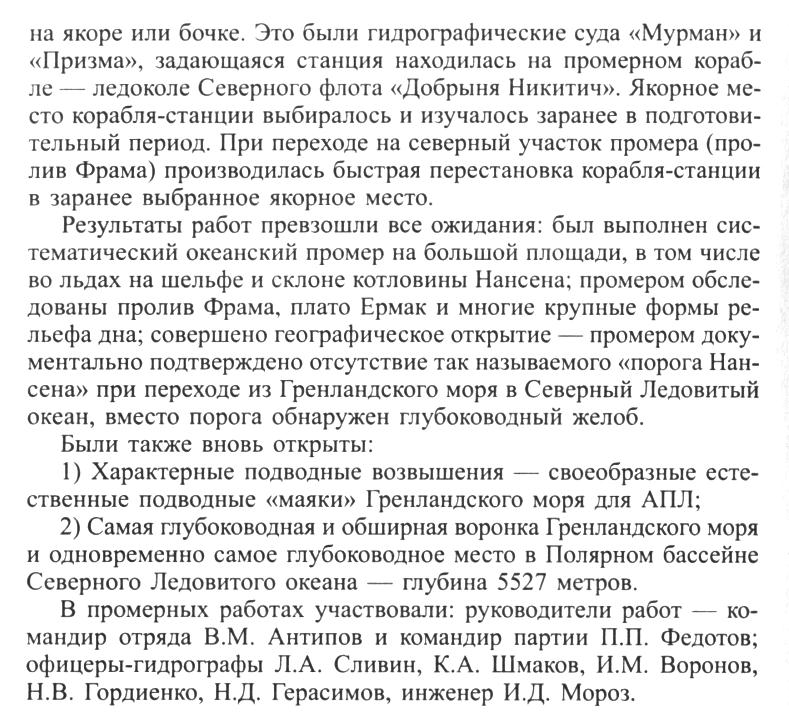 на якоре или бочке. Это были гидрографические суда «Мурман» и «Призма», задающаяся станция находилась на промерном корабле — ледоколе Северного флота «Добрыня Никитич». Якорное место корабля-станции выбиралось и изучалось заранее в подготовительный период. При переходе на северный участок промера (пролив Фрама) производилась быстрая перестановка корабля-станции в заранее выбранное якорное место.