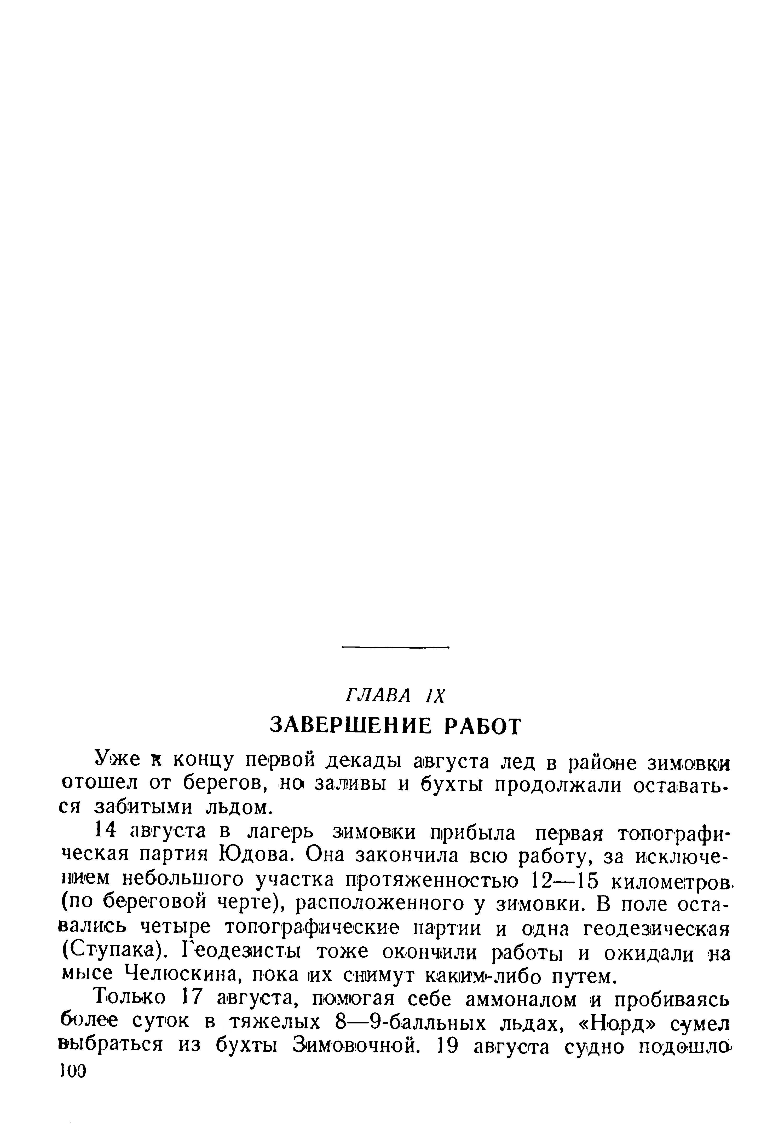 14 августа в лагерь зимовки прибыла первая топографическая партия Юдова. Она закончила всю работу, за исключением небольшого участка протяженностью 12—15 километров (по береговой черте), расположенного у зимовки. В поле оставались четыре топографические партии и одна геодезическая (Ступака). Геодезисты тоже окончили работы и ожидали на мысе Челюскина, пока их снимут каким-либо путем.