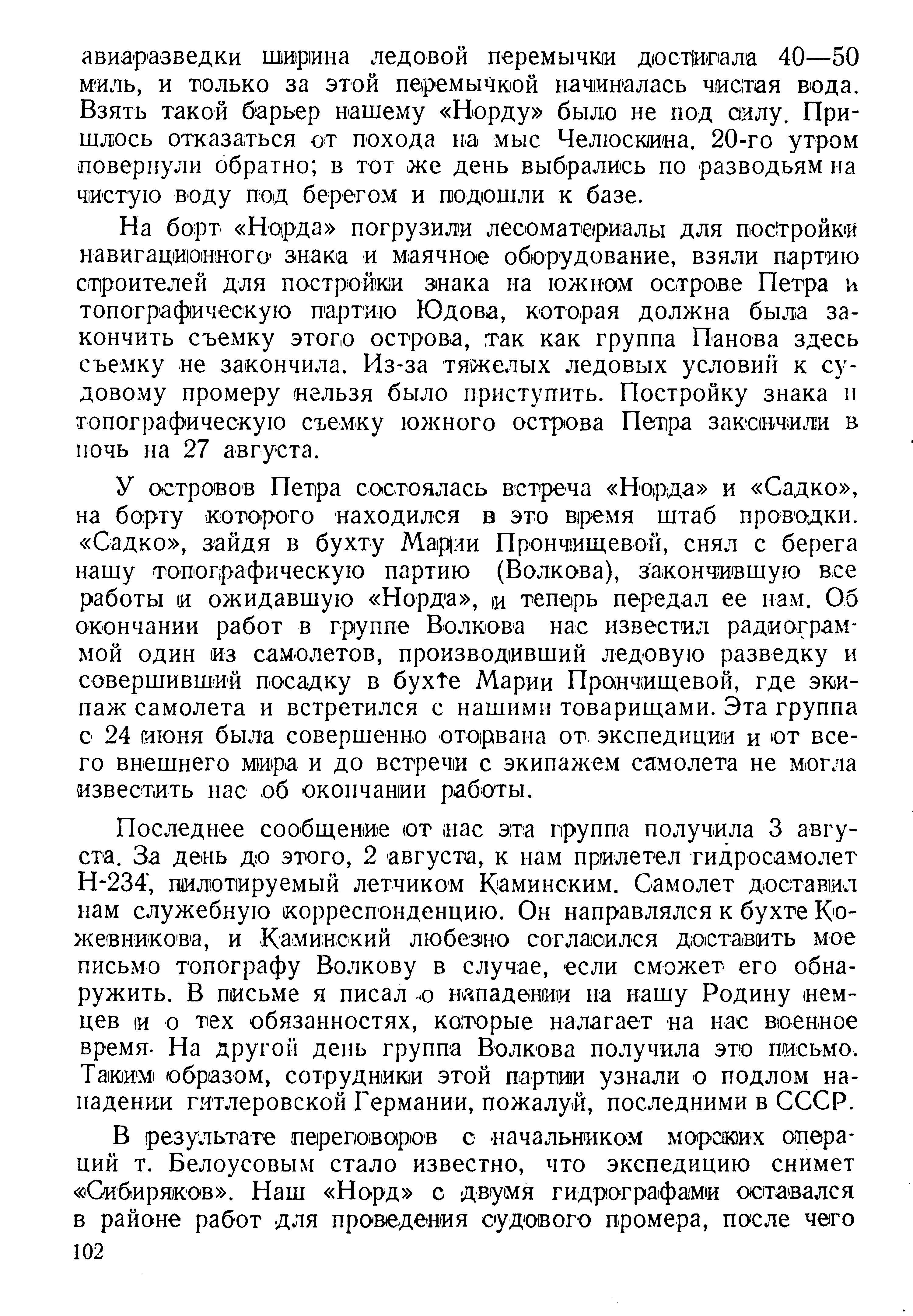 Последнее сообщение от нас эта группа получила 3 августа. За день до этого, 2 августа, к нам прилетел гидросамолет Н-234, пилотируемый летчиком Каминским. Самолет доставил нам служебную корреспонденцию. Он направлялся к бухте Кожевникова, и Каминский любезно согласился доставить мое письмо топографу Волкову в случае, если сможет его обнаружить. В письме я писал о нападении на нашу Родину немцев и о тех обязанностях, которые налагает на нас военное время. На другой день группа Волкова получила это письмо. Таким образом, сотрудники этой партии узнали о подлом нападении гитлеровской Германии, пожалуй, последними в СССР.