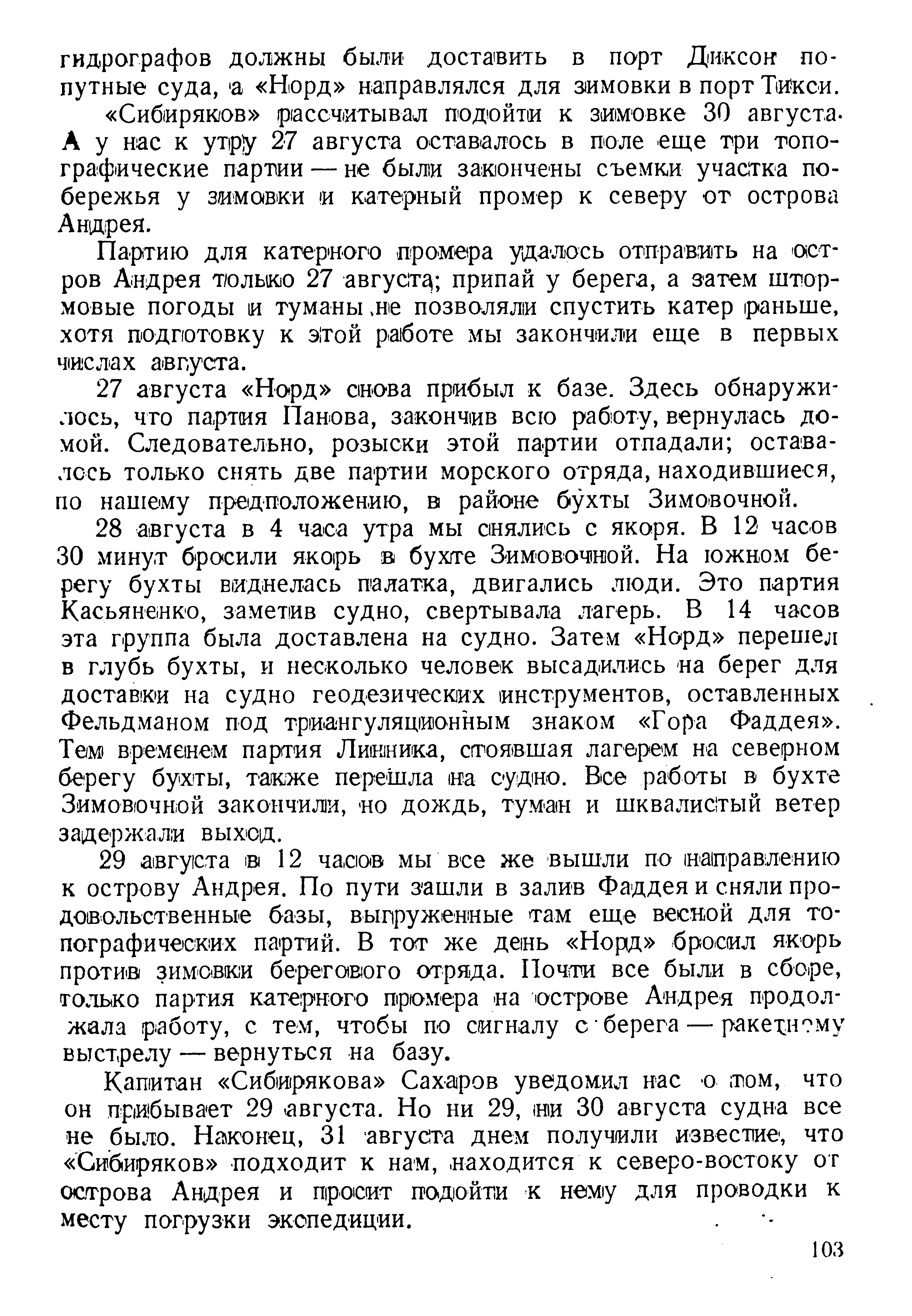 28 августа в 4 часа утра мы снялись с якоря. В 12 часов 30 минут бросили якорь в бухте Зимовочной. На южном берегу бухты виднелась палатка, двигались люди. Это партия Касьяненко, заметив судно, свертывала лагерь. В 14 часов эта группа была доставлена на судно. Затем «Норд» перешел в глубь бухты, и несколько человек высадились на берег для доставки на судно геодезических инструментов, оставленных Фельдманом под триангуляционным знаком «Гора Фаддея». Тем временем партия Линника, стоявшая лагерем на северном берегу бухты, также перешла на судно. Все работы в бухте Зимовочной закончили, но дождь, туман и шквалистый ветер задержали выход.