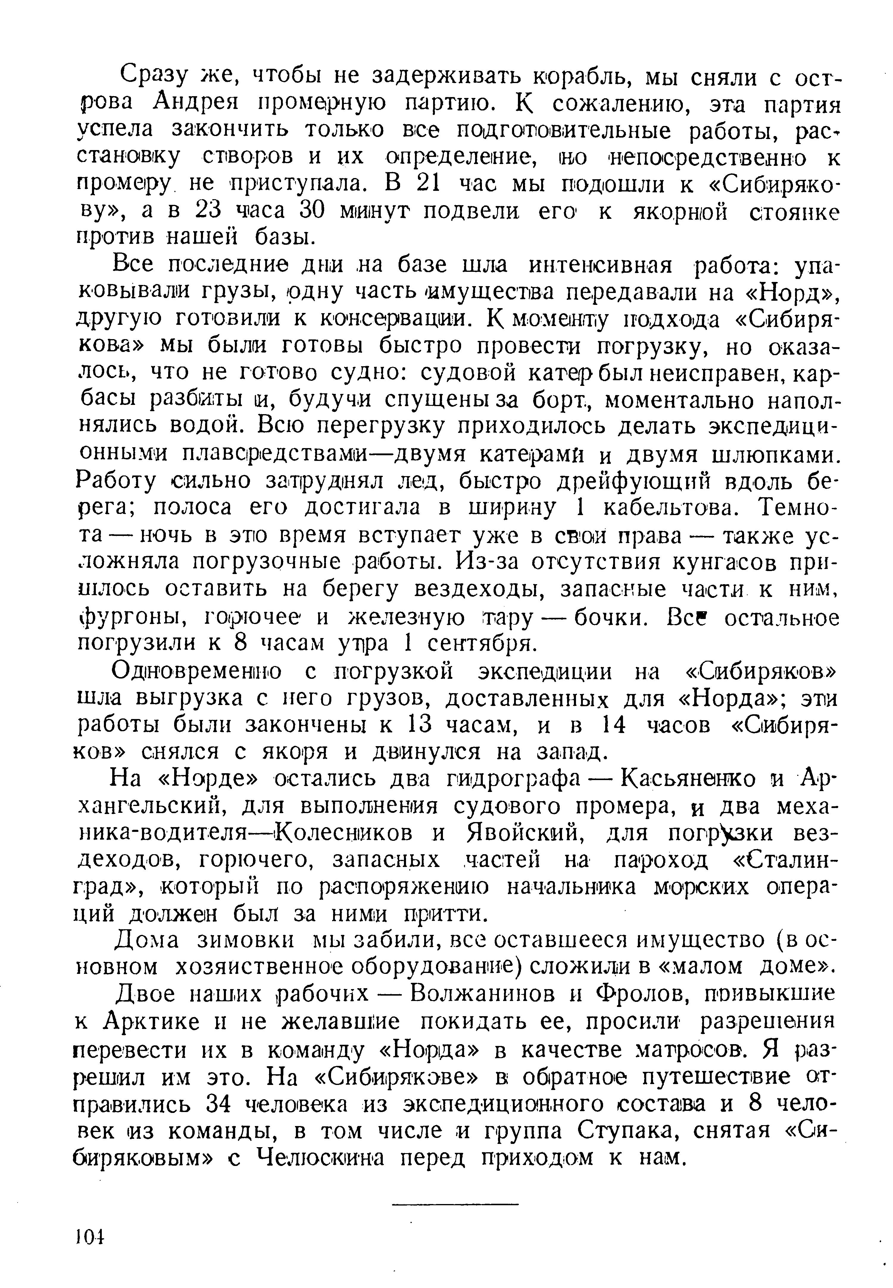 Двое наших рабочих — Волжанинов и Фролов, привыкшие к Арктике и не желавшие покидать ее, просили разрешения перевести их в команду «Норда» в качестве матросов. Я разрешил им это. На «Сибирякове» в обратное путешествие отправились 34 человека из экспедиционного состава и 8 человек из команды, в том числе и группа Ступака, снятая «СИбиряковым» с Челюскина перед приходом к нам.