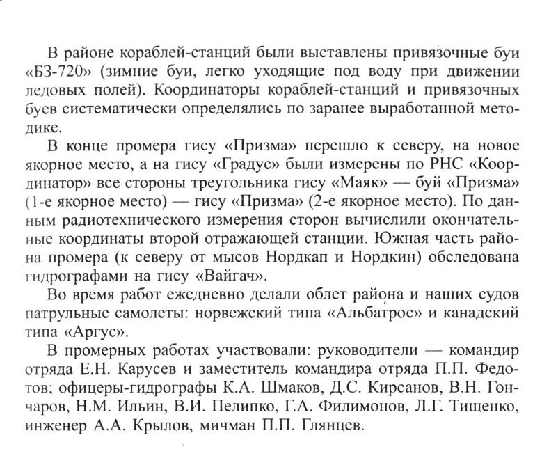 В конце промера гису «Призма» перешло к северу, на новое якорное место, а на гису «Градус» были измерены по РНС «Координатор» все стороны треугольника гису «Маяк» — буй «Призма» (1-е якорное место) — гису «Призма» (2-е якорное место). По данным радиотехнического измерения сторон вычислили окончательные координаты второй отражающей станции. Южная часть района промера (к северу от мысов Нордкап и Нордкин) обследована гидрографами на гису «Вайгач».