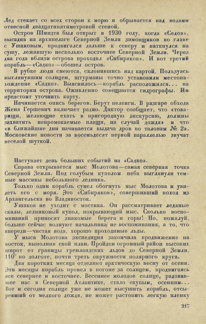 Ушаков не уходит с мостика. Он рассматривает ледяные скалы, ледниковый купол, покрывающий мыс. Сколько воспоминании приносят знакомые берега и горы! Но, пожалуй, больше сейчас волнуют начальника не воспоминания, а то, что впереди — чистая вода, хорошо проходимые льды.