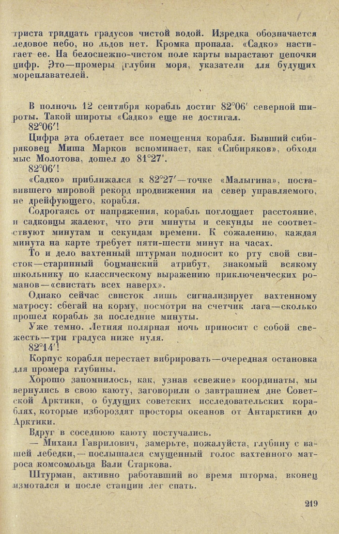 Первая на земном шаре проба грунта с ложа Ледовитого океана старательно укутана и уложена в деревянную коробку. Корабль идет к северу. Мачты его украшены флагами. Из репродукторов грохочет бравурный марш Шуберта. «Садко» проходит последние мили, отделяющие его от самой северной точки, когда либо достигнутой управляемым судном. Ожидая сигнального гудка станции, мы говорим о родине, о радости, с которой страна встретит наш успех, о близких, родных и товарищах на Большой земле.