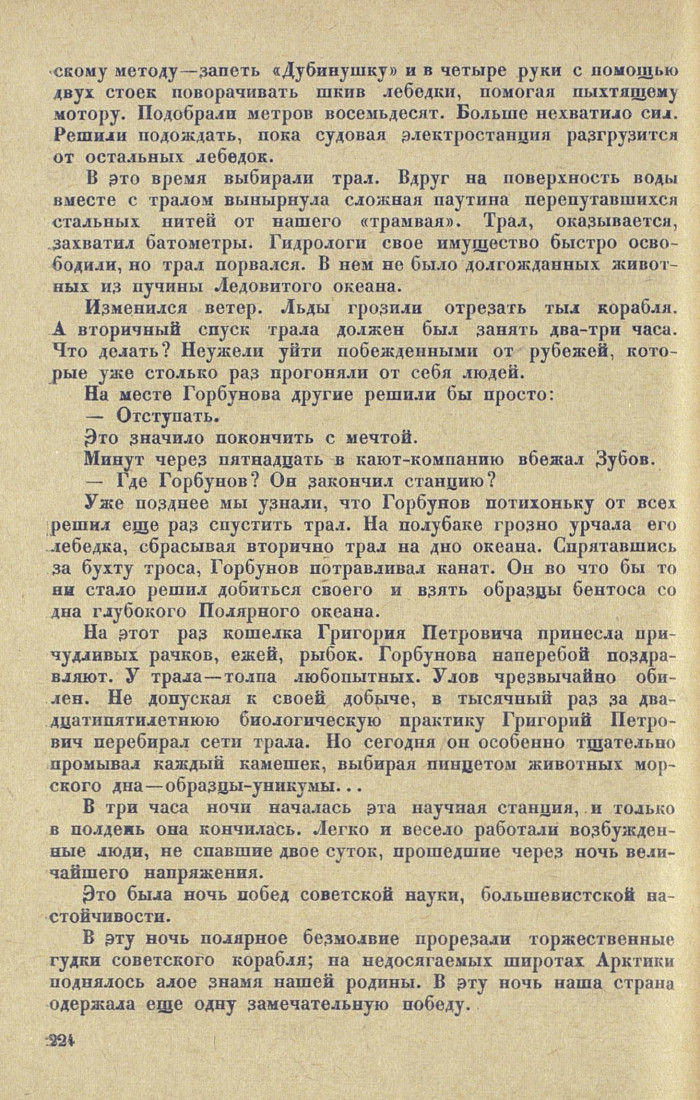 скому методу — запеть «Дубинушку» и в четыре руки с помощью двух стоек поворачивать шкив лебедки, помогая пыхтящему мотору. Подобрали метров восемьдесят. Больше нехватило сил. Решили подождать, пока судовая электростанция разгрузится от остальных лебедок.