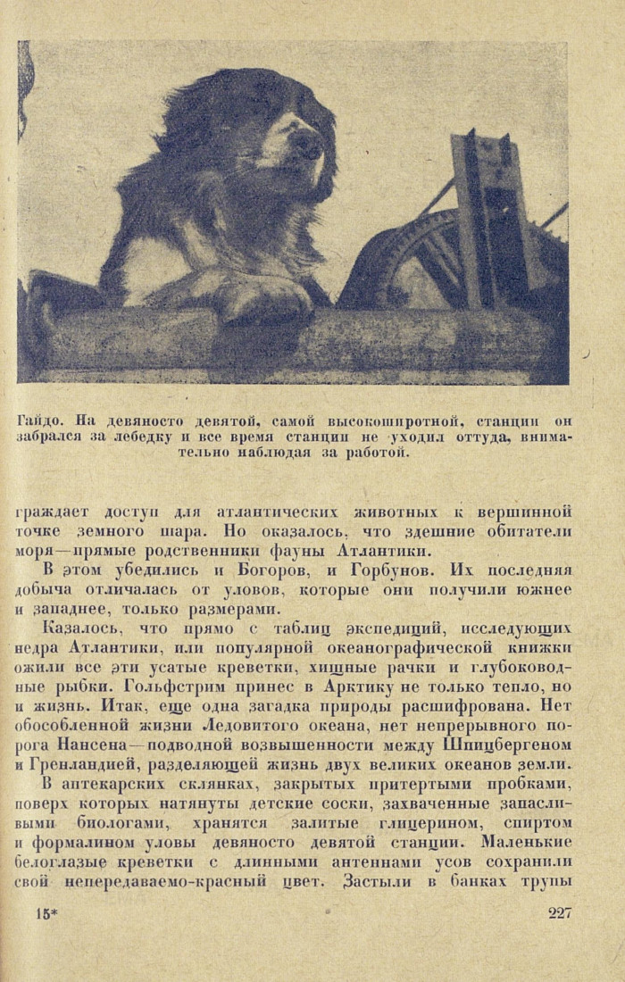 Трос сматывается утомительно долго. Заходим к Г. П. Горбунову. Склонившись над стеклянными кюветами, заваленными грудами животных, выловленных на дневной станции у мыса Молотова, он старательно выбирает пинцетом рачков и креветок, сортируя животных по классам и родам. Далее сейчас Григорий Петрович верен себе. Он не уходит из лаборатории.