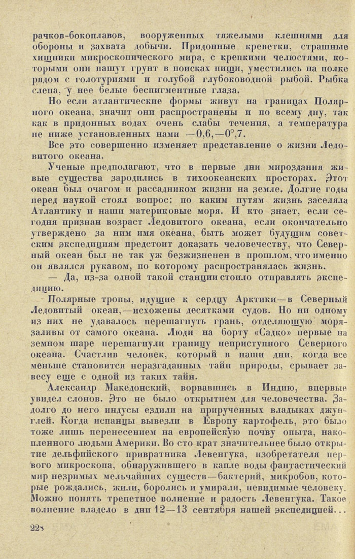 Ученые предполагают, что в первые дни мироздания живые существа зародились в тихоокеанских просторах. Этот океан был очагом и рассадником жизни на земле. Долгие годы перед наукой стоял вопрос: по каким путям жизнь заселяла Атлантику и наши материковые моря. И кто знает, если сегодня признан возраст Ледовитого океана, если окончательно утверждено за ним имя океана, быть может будущим советским экспедициям предстоит доказать человечеству, что Северный океан был не так уж безжизненен в прошлом, что именно он являлся рукавом, по которому распространялась жизнь.