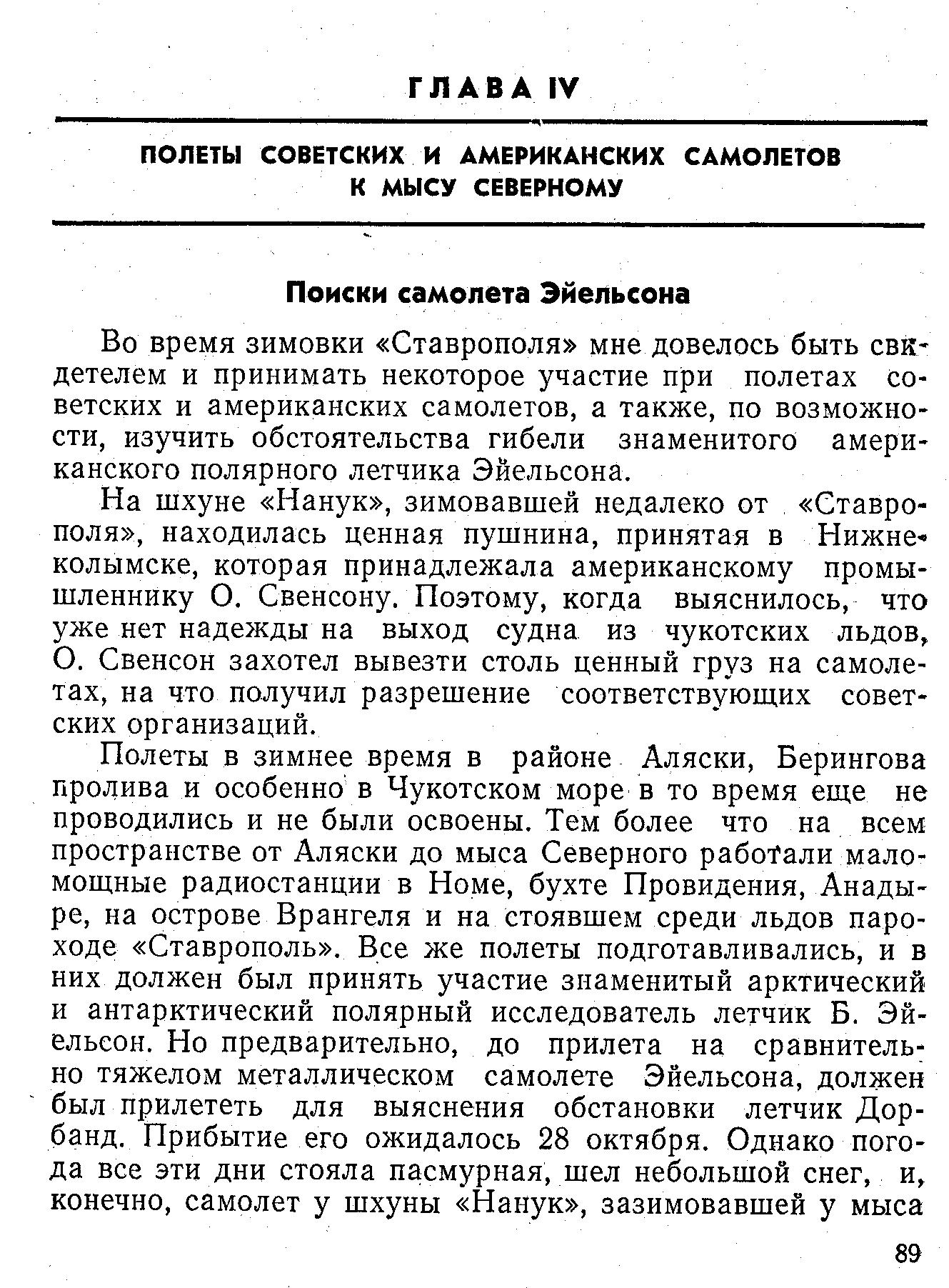 Во время зимовки «Ставрополя» мне довелось быть свидетелем и принимать некоторое участие при полетах советских и американских самолетов, а также, по возможности, изучить обстоятельства гибели знаменитого американского полярного летчика Эйельсона.