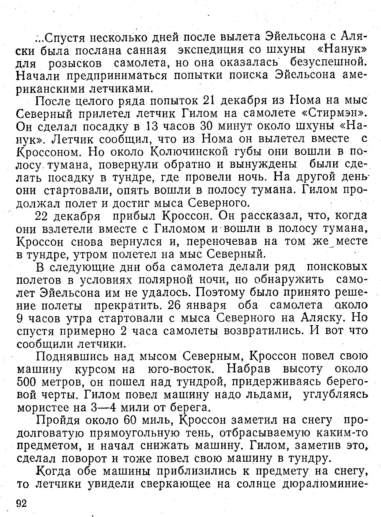 Поднявшись над мысом Северным, Кроссон повел свою машину курсом на юго-восток. Набрав высоту около 500 метров, он пошел над тундрой, придерживаясь береговой черты. Гилом повел машину надо льдами, углубляясь мористее на 3—4 мили от берега.