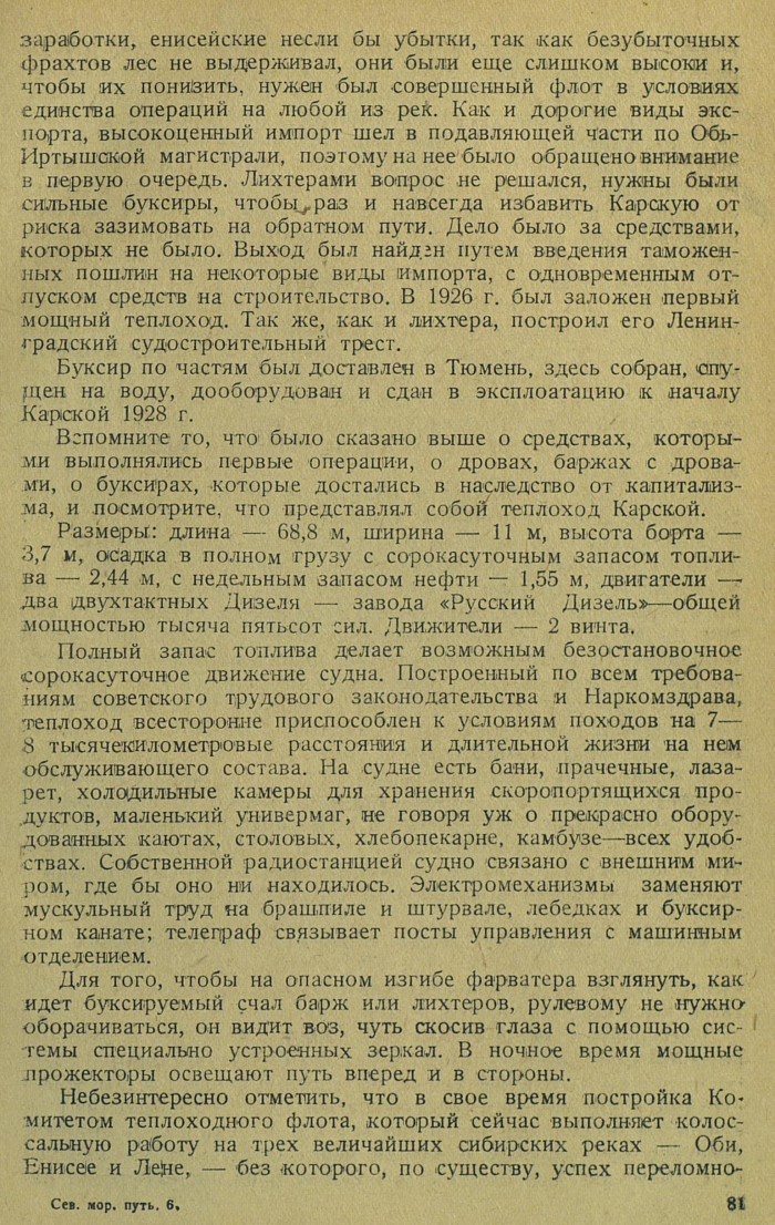 заработки, енисейские несли бы убытки, так как безубыточных фрахтов лес не выдерживал, они были еще слишком высоки и, чтобы их понизить, нужен был совершенный флот в условиях единства операций на любой из рек. Как и дорогие виды экспорта, высокоценный импорт шел в подавляющей части по Обь-Иртышской магистрали, поэтому на нее было обращено внимание в первую очередь. Лихтерами вопрос не решался, нужны были сильные буксиры, чтобы раз и навсегда избавить Карскую от риска зазимовать на обратном пути. Дело было за средствами, которых не было. Выход был найден путем введения таможенных пошлин на некоторые виды импорта, с одновременным отпуском средств на строительство. В 1926 г. был заложен первый мощный теплоход. Так же, как и лихтера, построил его Ленинградский судостроительный трест.
