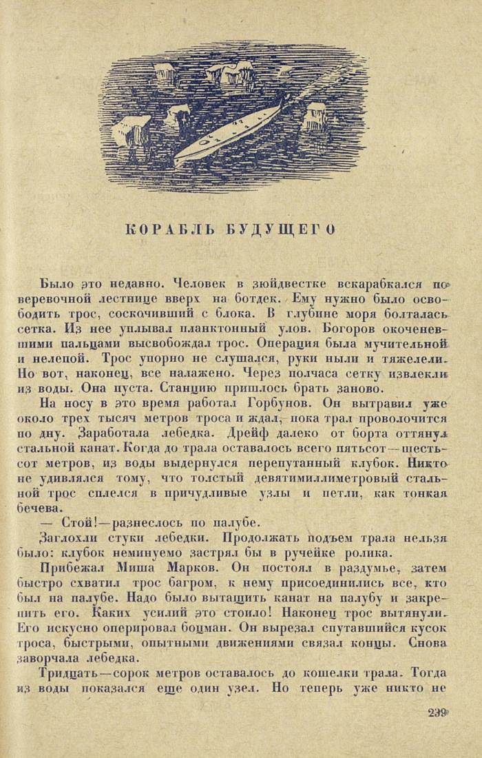 КОРАБЛЬ БУДУЩЕГОБыло это недавно. Человек в зюйдвестке вскарабкался по веревочной лестнице вверх на ботдек. Ему нужно было освободить трос, соскочивший с блока. В глубине моря болталась сетка. Из нее уплывал планктонный улов. Богоров окоченевшими пальцами высвобождал трос. Операция была мучительной и нелепой. Трос упорно не слушался, руки ныли и тяжелели. Но вот, наконец, все налажено. Через полчаса сетку извлекли из воды. Она пуста. Станцию пришлось брать заново.