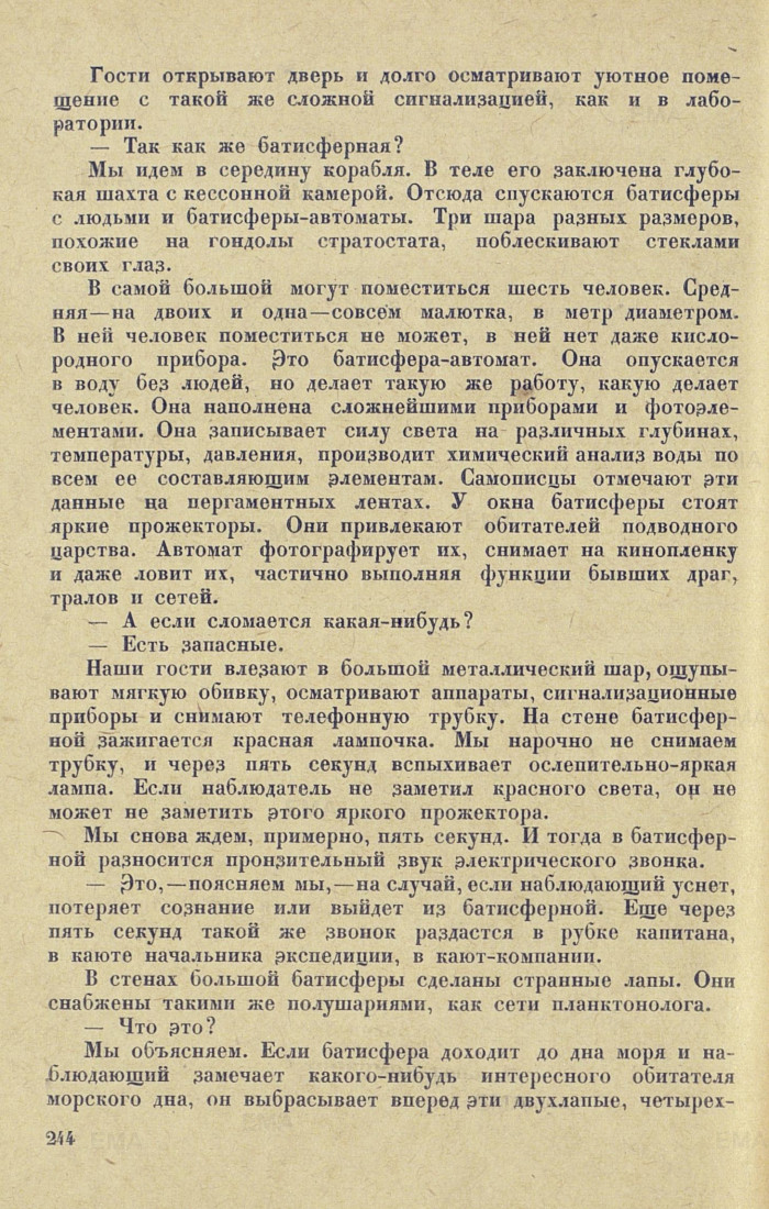 В самой большой могут поместиться шесть человек. Средняя — на двоих и одна — совсем малютка, в метр диаметром. В ней человек поместиться не может, в ней нет даже кислородного прибора. Это батисфера-автомат. Она опускается в воду без людей, но делает такую же работу, какую делает человек. Она наполнена сложнейшими приборами и фотоэлементами. Она записывает силу света на различных глубинах, температуры, давления, производит химический анализ воды по всем ее составляющим элементам. Самописцы отмечают эти данные на пергаментных лентах. У окна батисферы стоят яркие прожекторы. Они привлекают обитателей подводного царства. Автомат фотографирует их, снимает на кинопленку и даже ловит их, частично выполняя функции бывших драг, тралов и сетей.