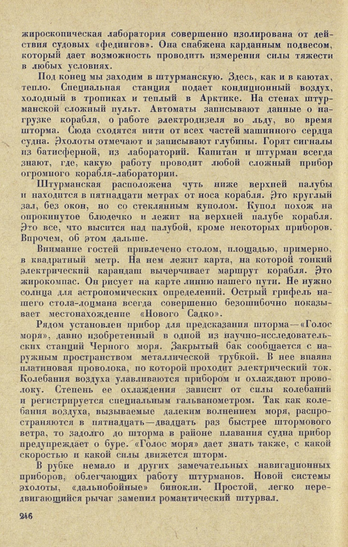 Внимание гостей привлечено столом, площадью, примерно, в квадратный метр. На нем лежит карта, на которой тонкий электрический карандаш вычерчивает маршрут корабля. Это жирокомпас. Он рисует на карте линию нашего пути. Не нужно солнца для астрономических определений. Острый грифель нашего стола-лоцмана всегда совершенно безошибочно показывает местонахождение «Нового Садко».