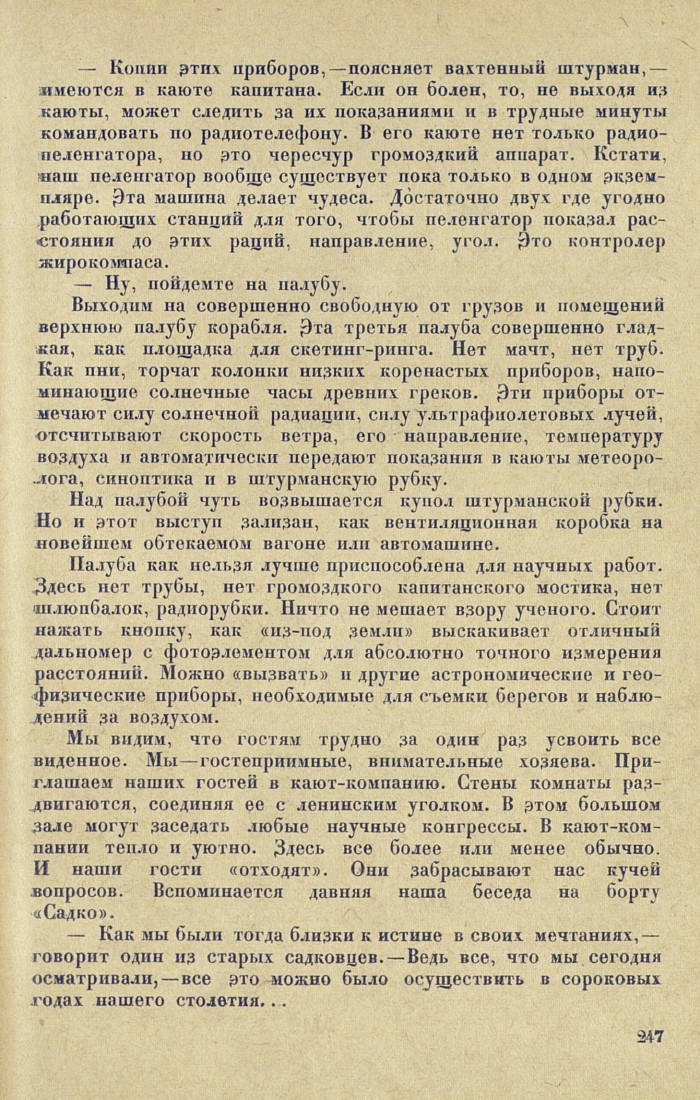 Палуба как нельзя лучше приспособлена для научных работ. Здесь нет трубы, нет громоздкого капитанского мостика, нет шлюпбалок, радиорубки. Ничто не мешает взору ученого. Стоит нажать кнопку, как «из-под земли» выскакивает отличный дальномер с фотоэлементом для абсолютно точного измерения расстояний. Можно «вызвать» и другие астрономические и геофизические приборы, необходимые для съемки берегов и наблюдений за воздухом.